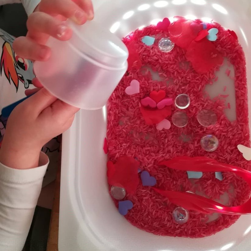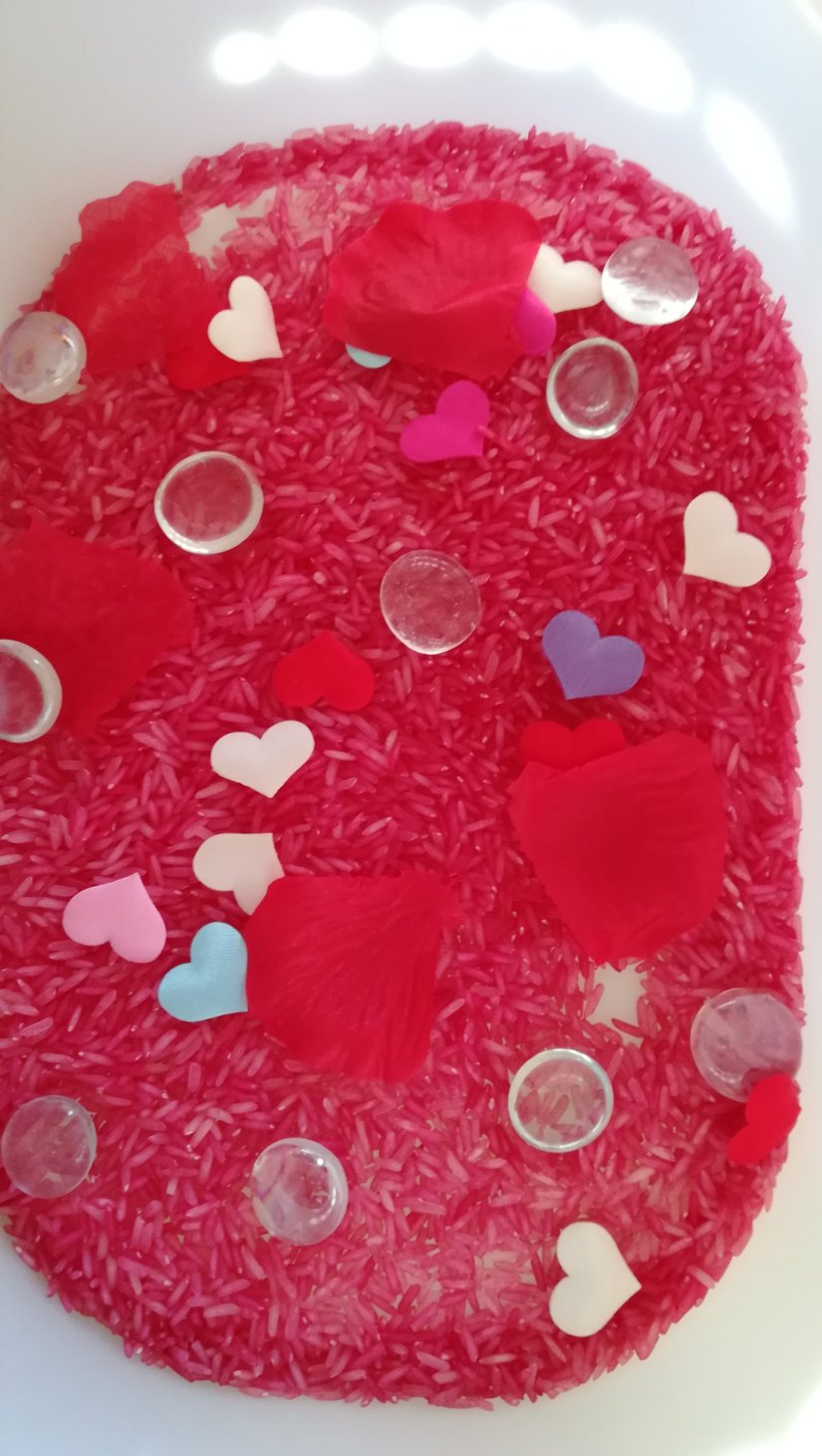 Pour ce bac j’ai coloré du riz avec du colorant alimentaire dans un sac puis j’ai ajouté deux gouttes de huile essentielle de lavande. Puis j’ai ajouté} des galets en verre des feuilles de rose en tissu et des petits cœurs en tissus de différents couleurs.