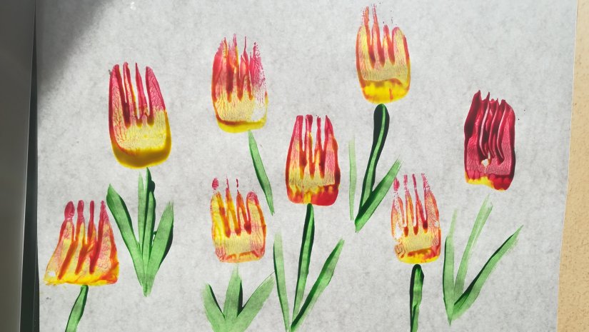 On commence fort entre notre expérience avec les fleurs et maintenant la peinture mais j’étais motivée et les filles aussi. Elles ont adoré de peindre avec les fourchettes. Le fait d’utiliser un objet du quotidien les a surprise. Même moi je n’y croyais pas trop en cette technique mais j’ai été surprise par l’efficacité.