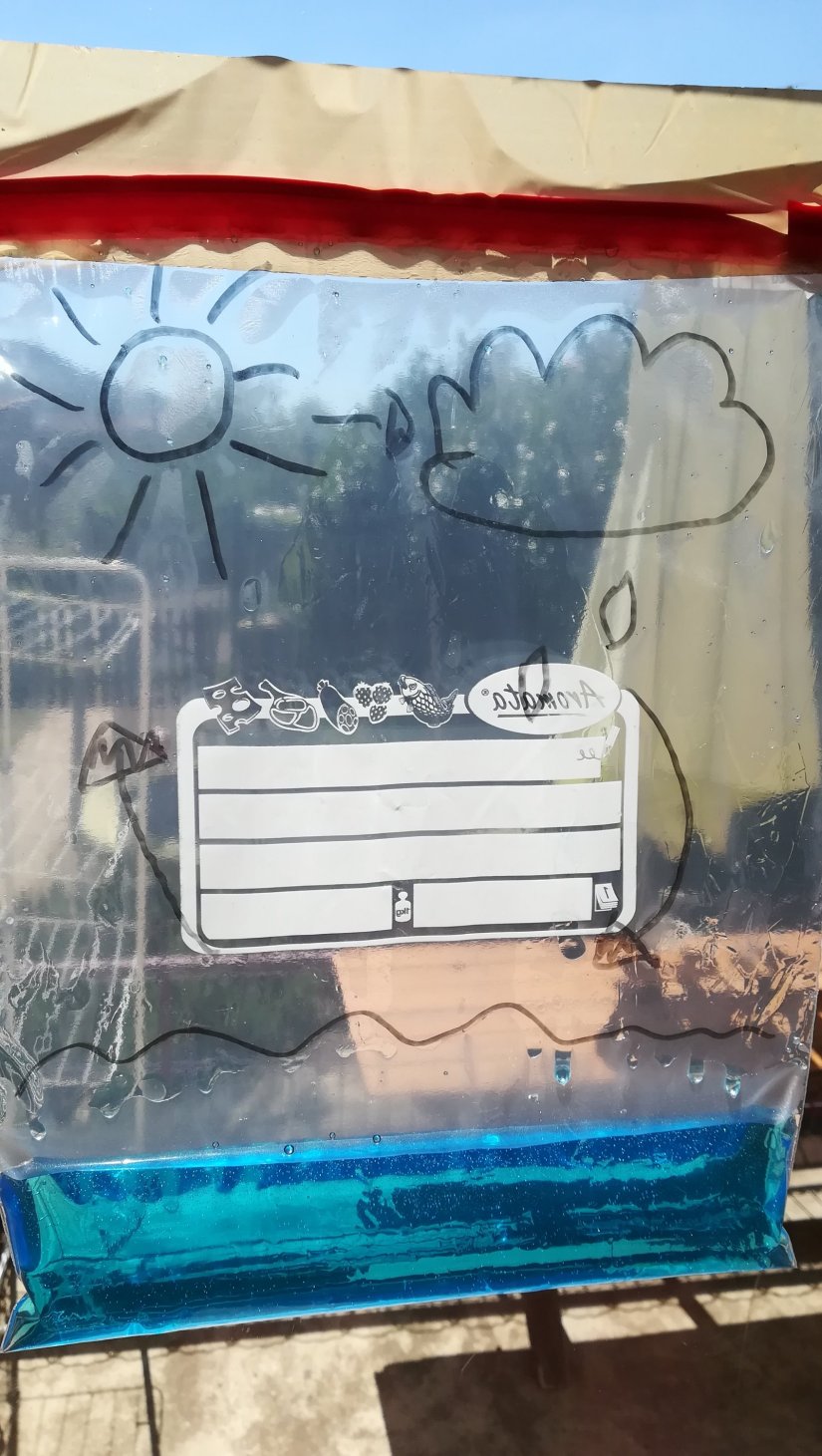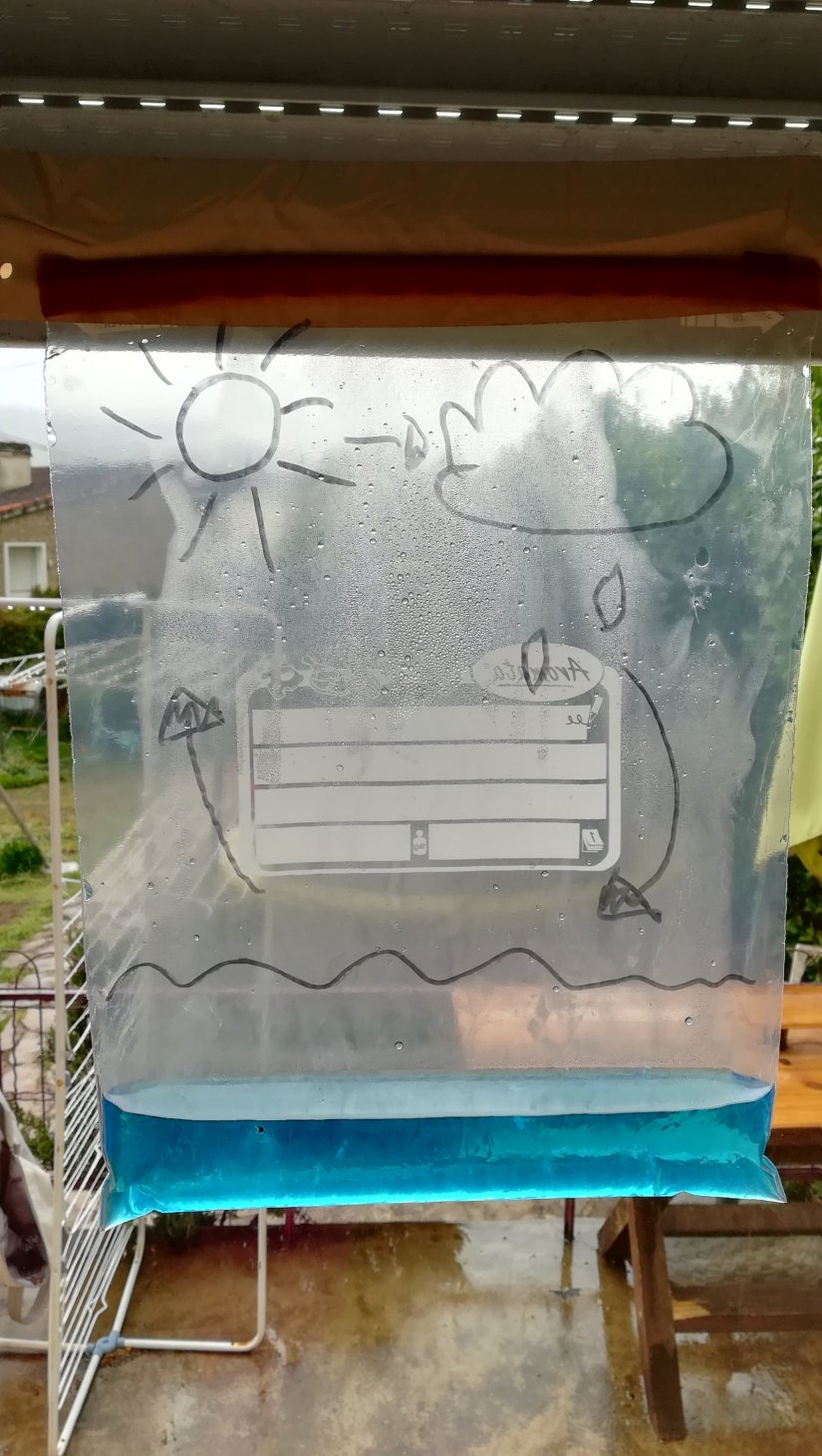 Cette activité était une des plus simple mais aussi une des activités qui teste la patience des enfants le plus. Il vous faudra un sac zip lock un peu d’eau et le tour est joué. Si vous le souhaitez vous pouvez faire des dessins et des flèches pour mieux expliquer le cycle de l’eau. Voilà en photos la réalisation et le résultat après avoir attendu trois jours.