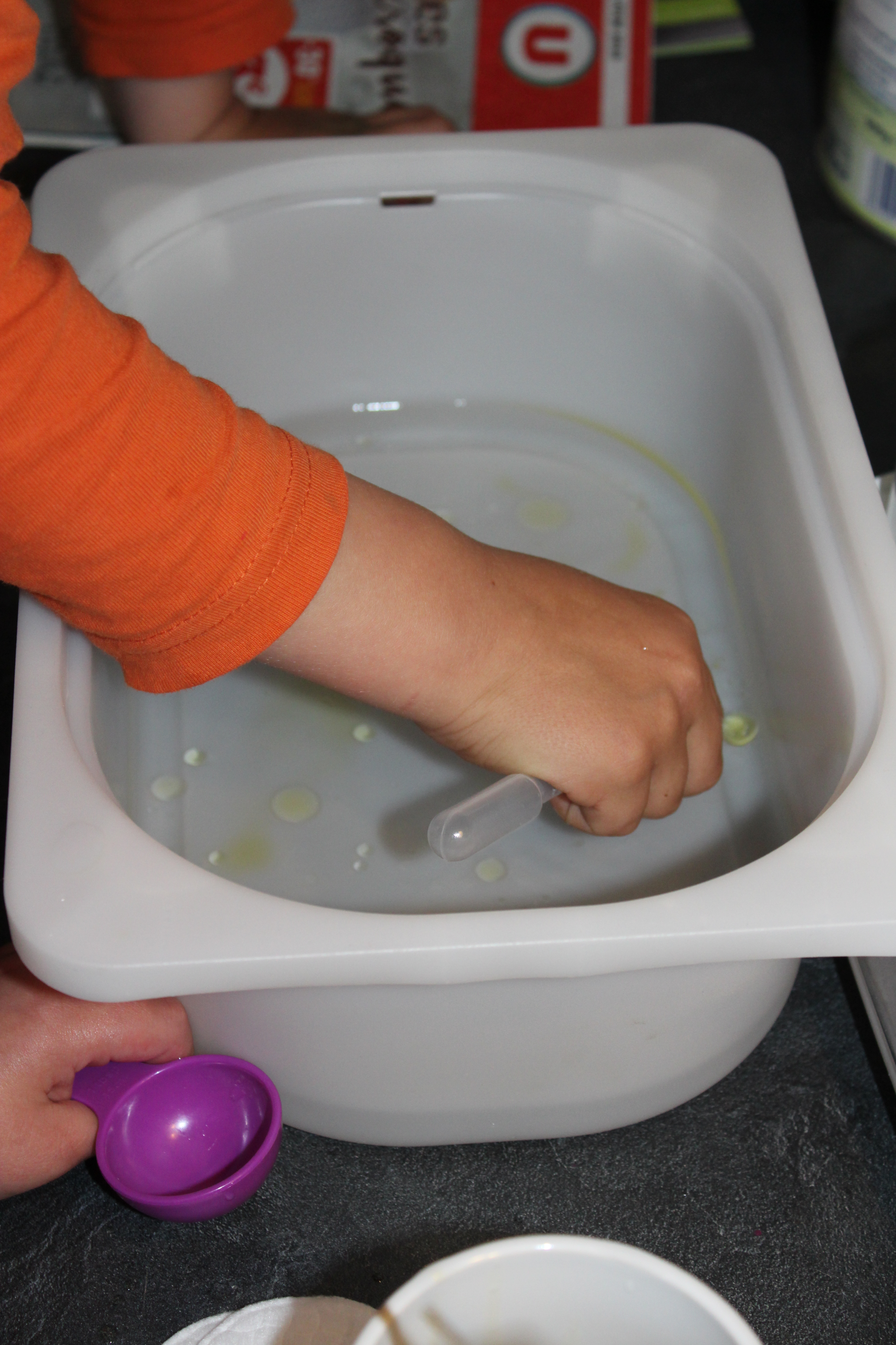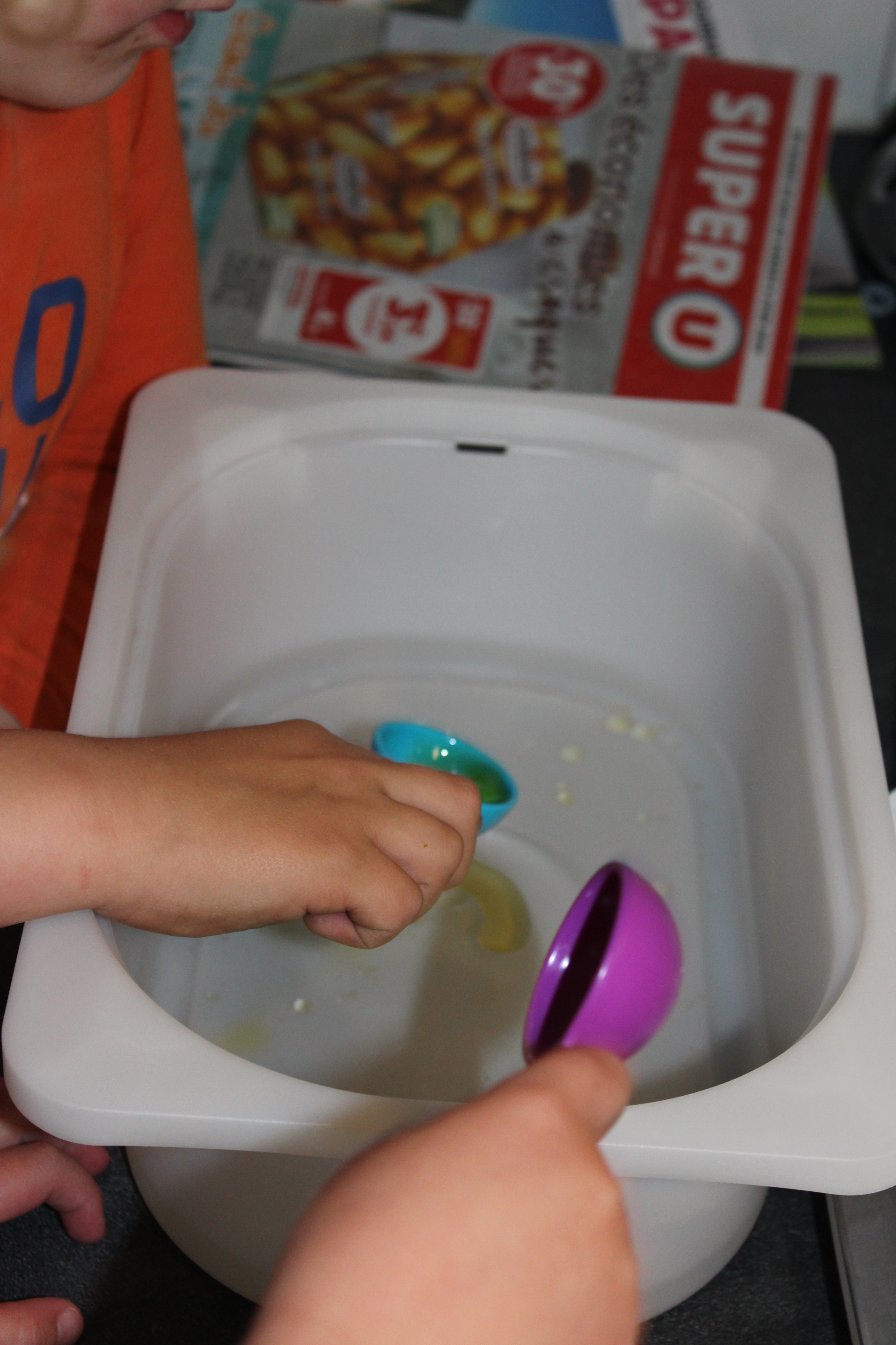 Nous avons aussi réaliser le projet STEM sur le thème de l’océan: nettoyage de la mer. Avant de leur laisser libre cour d’essayer comment mieux nettoyer l’huile dans l’eau je leur ai raconté une histoire d’un bateau en mer qui a eu un accident et qui maintenant coule de l’huile qui va rendre les animaux de la mer malades.