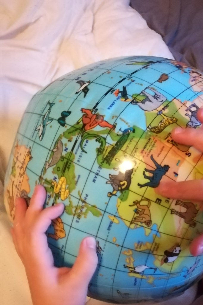Le ballon de la terre reste une façon économique d’expliquer que la terre est ronde et la montrer en 3D. Nous travaillons sur le thème des animaux du monde cette année alors j’ai choisi celui-là.