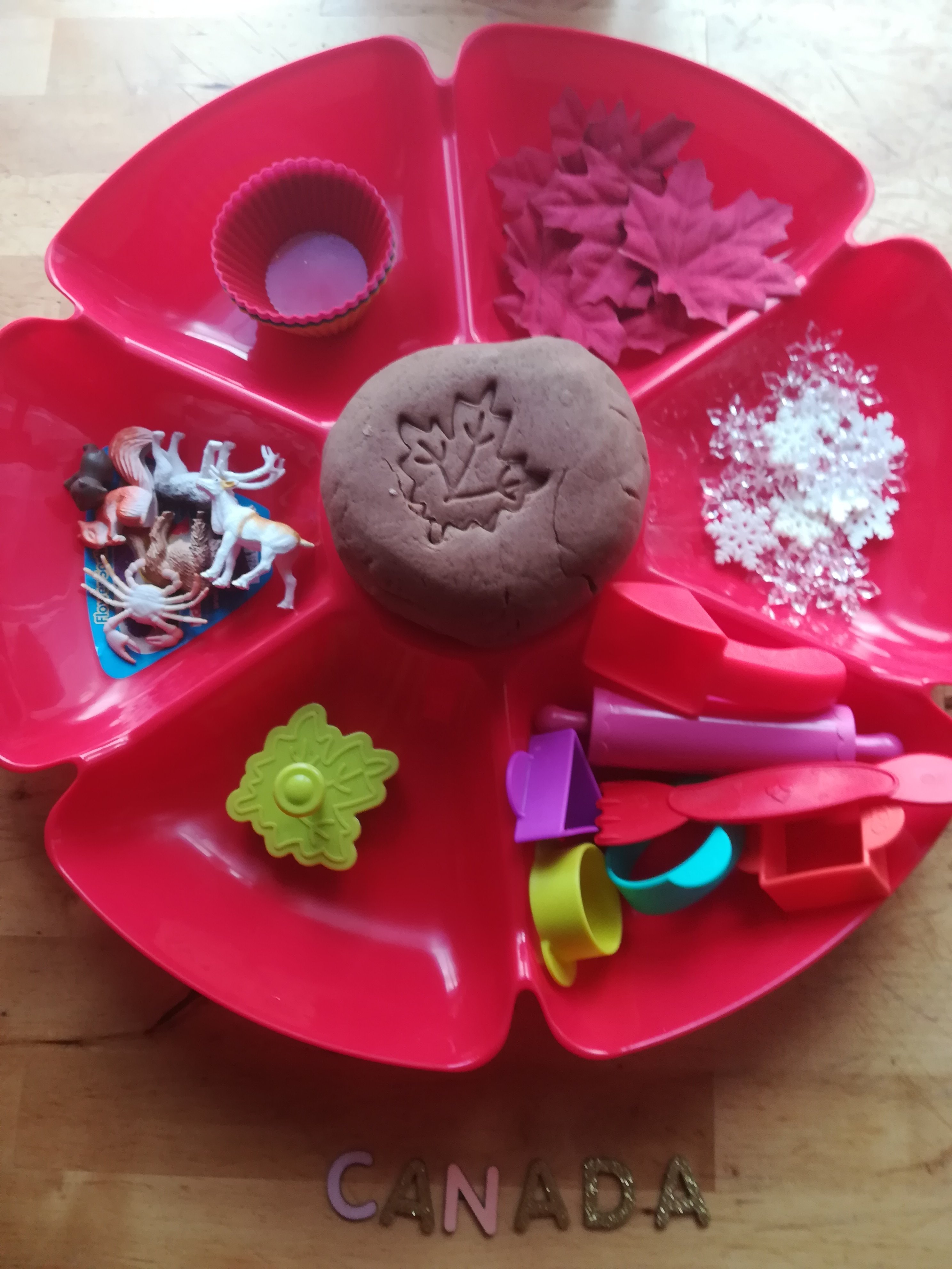 Chez nous les jeux sensorielles c’est ceux que les enfants aiment le plus. La pâte à modeler est vraiment le produit idéal pour travailler la motricité fine et la créativité. J’ai trouvé la recette ici. J’ai simplement converti les mesures en grammes. Voila la recette de la pâte à modeler au sirop d’érable: