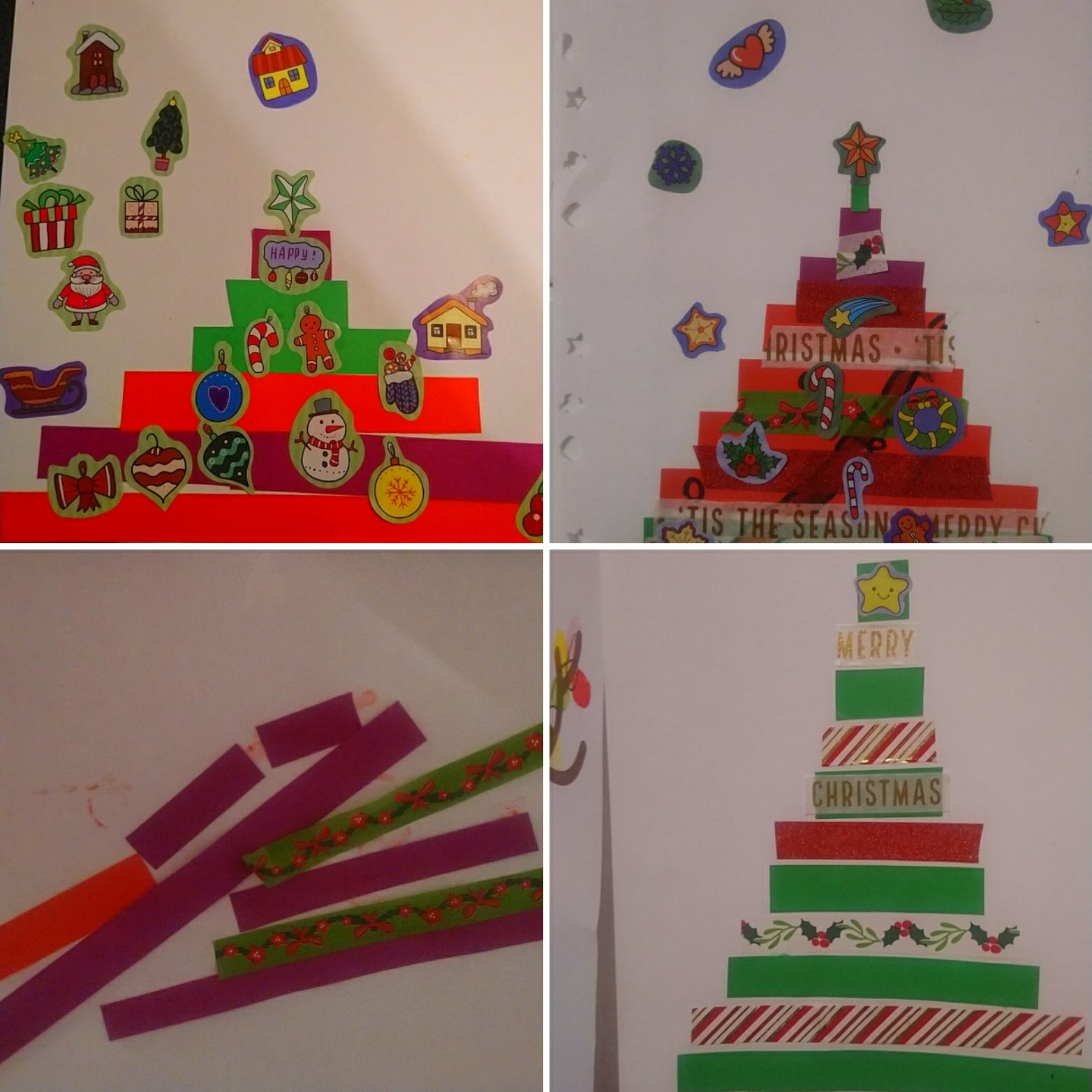 Avec mes trouvailles à Action ce matin nous avons réalisé des sapins avec des bandes de papier coloré, du washi tape, des gommettes et des découpe papier avec des formes de Noël. Même moi j’ai été créative 😀