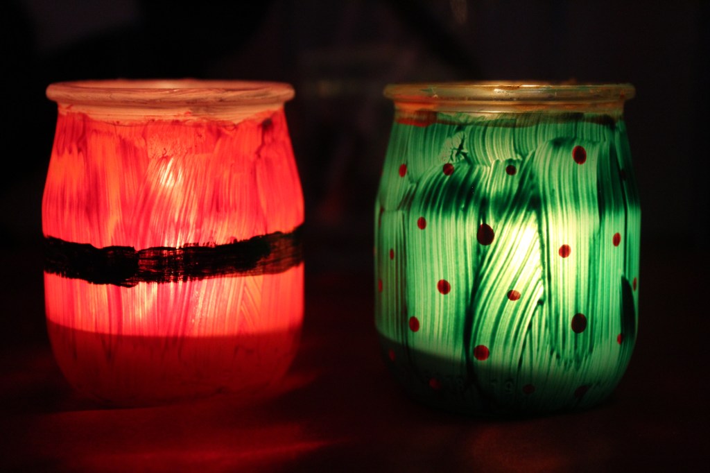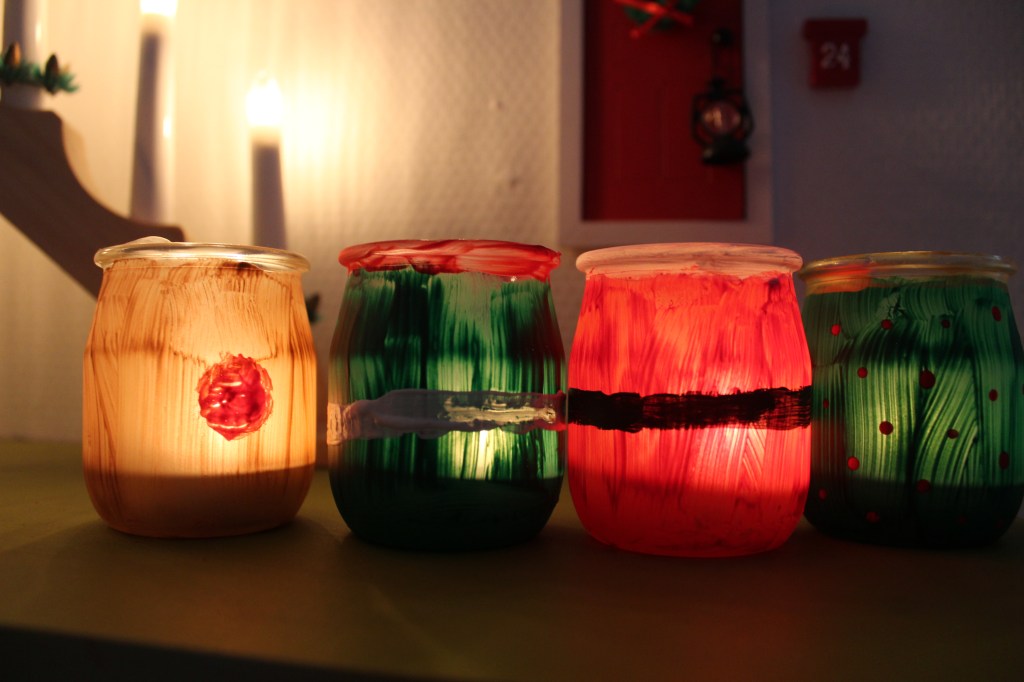 Avec les grandes nous avons créé des photophores de Noël en utilisant de pots de yaourts en verre type la laitière, un peu de peinture acrylique et beaucoup d’imagination.
