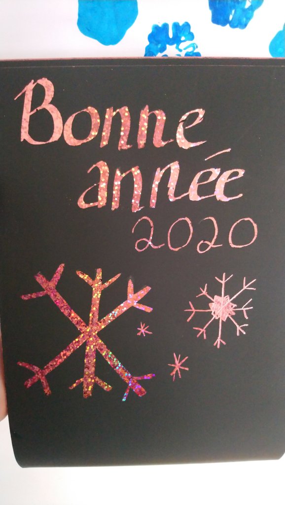 J’ai trouvé un joli pack à Action pour une modeste somme. L’idée était de faire nos cartes de vœux à envoyer à la famille. Malheureusement pour la famille en Suède les enfants ont préféré d’enlever tout le noir afin de montrer le joli rose hologramme en dessous.