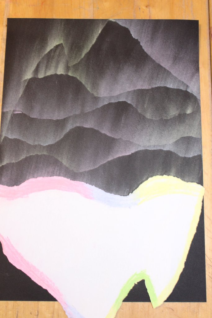 Il vous faut des craies grasses, du papier noir et une feuille blanche que vous allez déchirer en forme de montagnes.