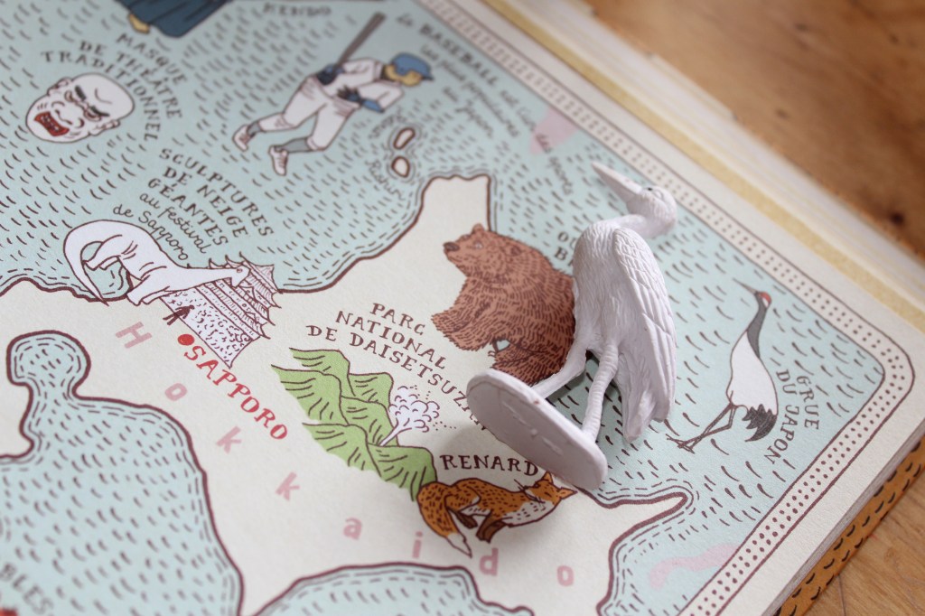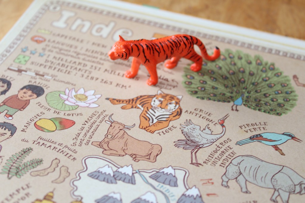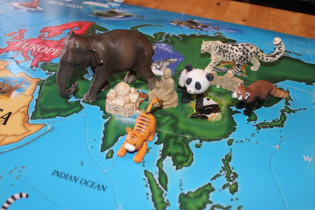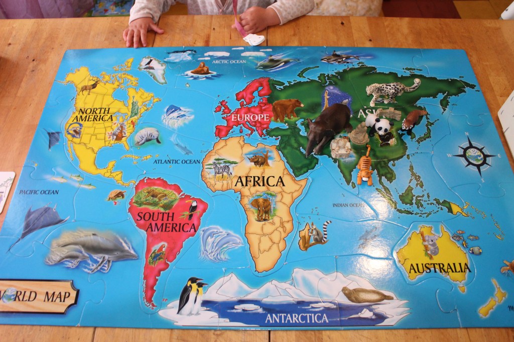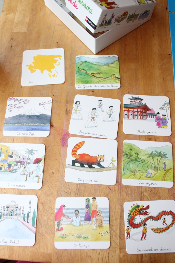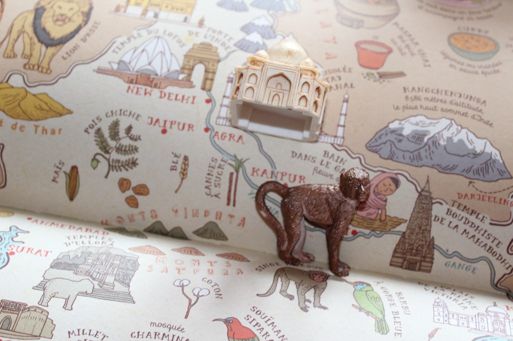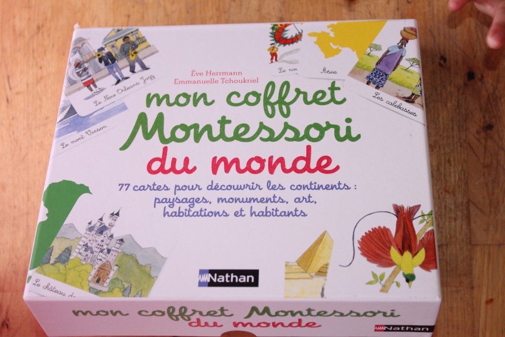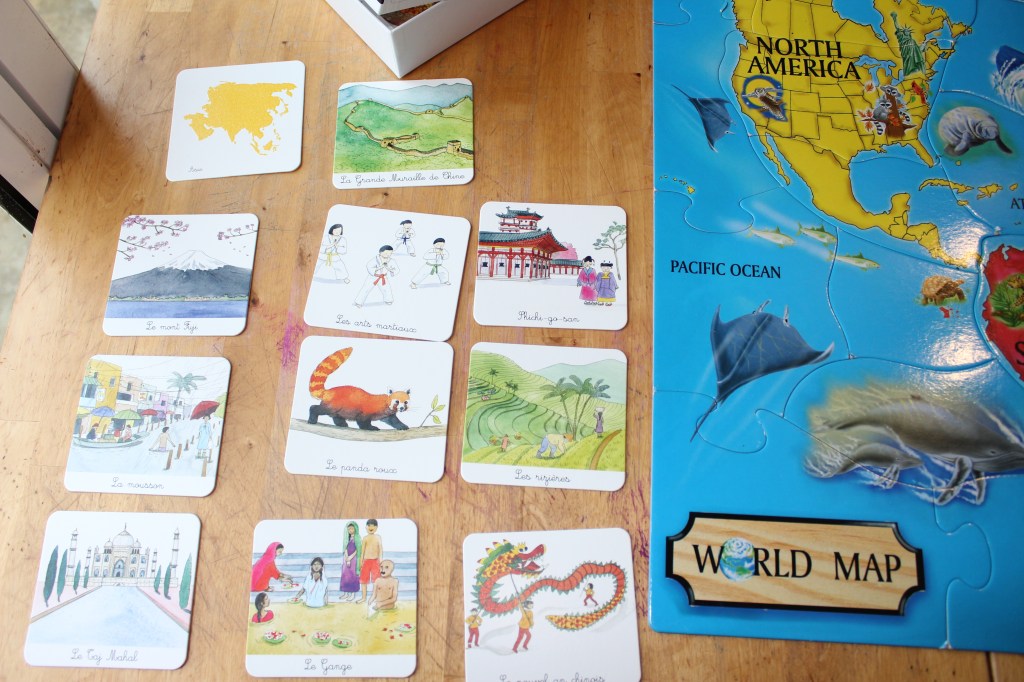 Pour faire le premier petit cours de géographie j’ai utilisé des figurines des monuments de Safari et des figurines d’animaux qu’on avait déjà à la maison. Le coffret Montessori vient d’ici. Nous avons aussi utilisé notre puzzle géant du monde.