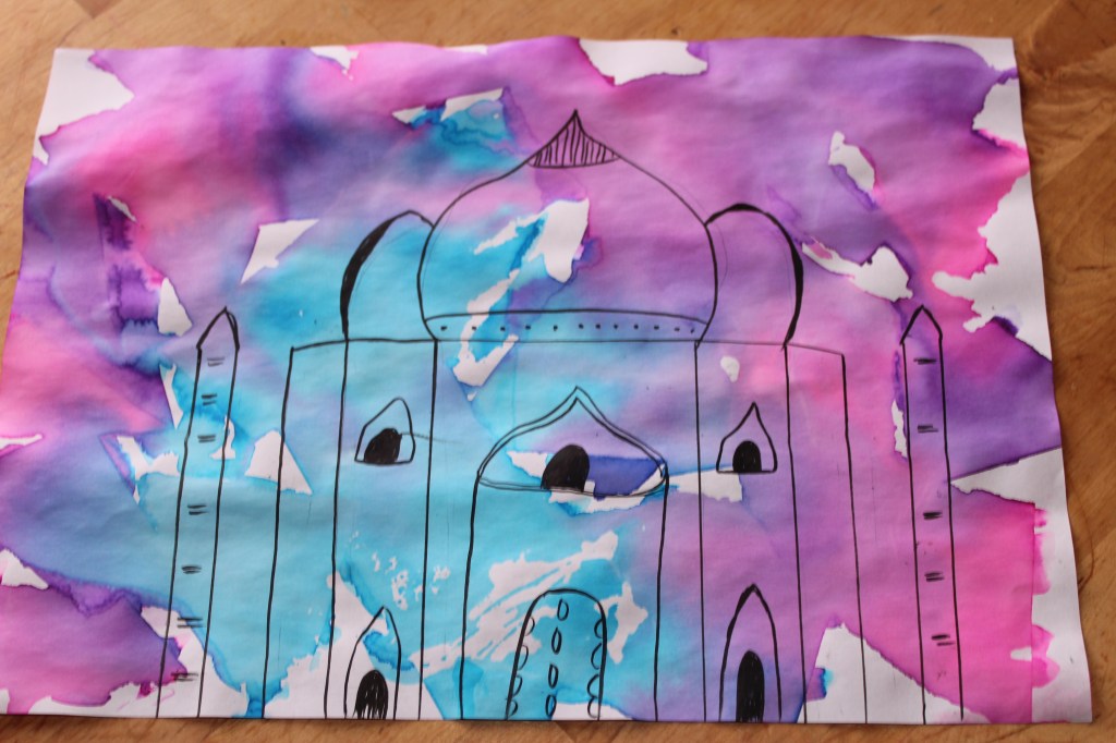 Nous avons réalisé ce Taj Mahal avec l’aide de ce tuto. On avait pas besoin de grand chose d’autre que du papier soie et un pinceau avec de l’eau.