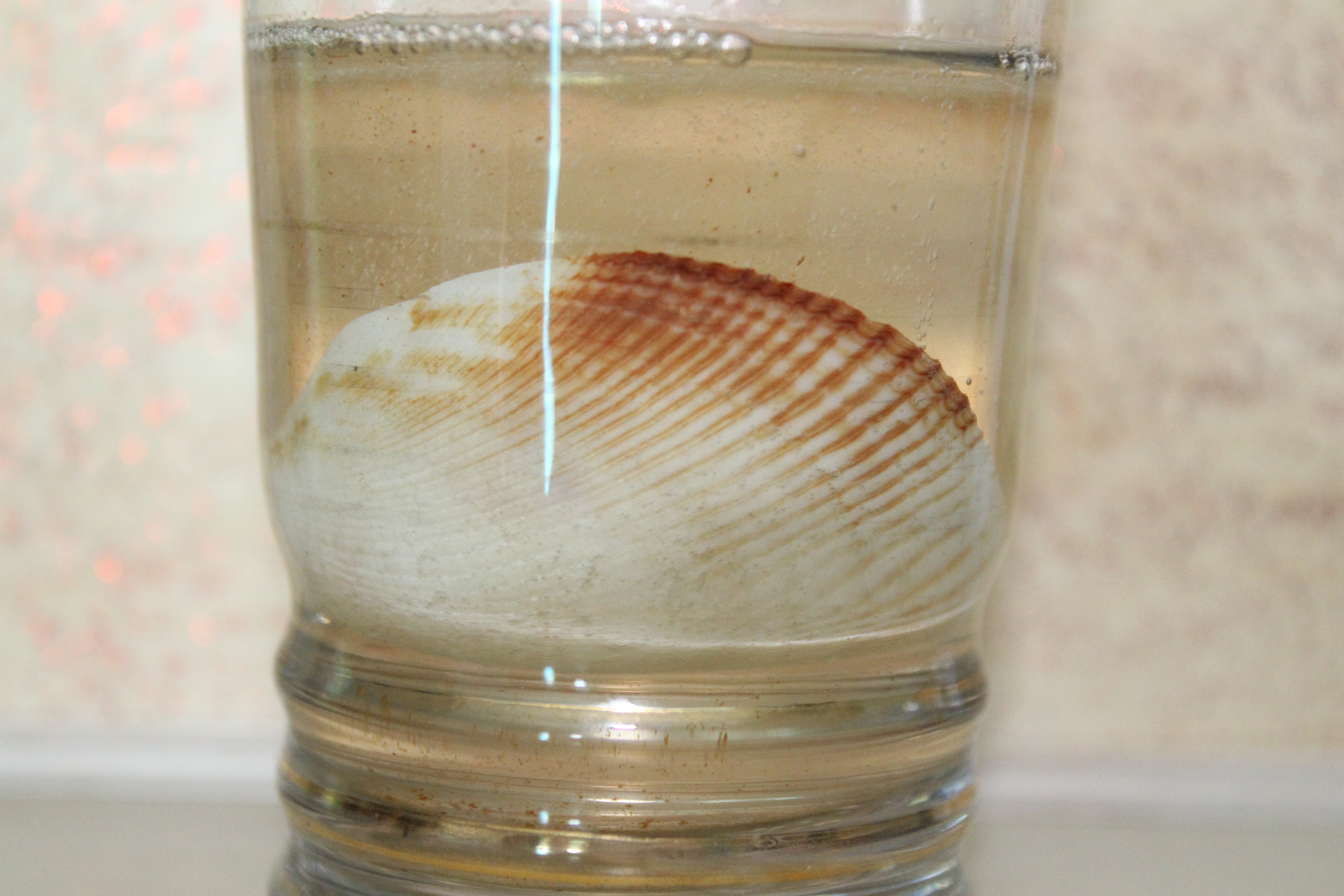Le coquillage se dissout lentement dans le vinaigre et disparaît complètement (en fonction de sa taille) après deux à trois jours. Un acide, comme par exemple l’acide acétique qui se trouve dans le vinaigre, peut dissoudre le calcaire. Quand le calcaire se dissout on peut observer des bulles dans le vinaigre c’est le dioxyde de carbone (CO2), appelé communément gaz carbonique.