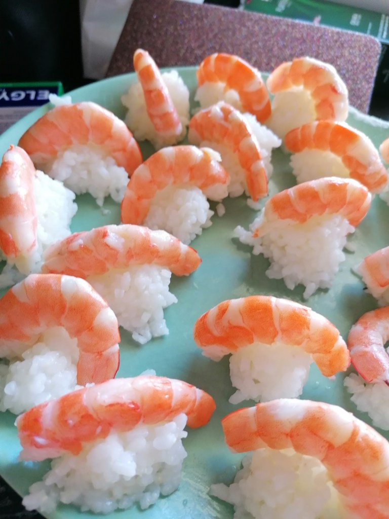 A l’issue de cette activité les enfants avaient envie de goûter du vrai sushi. Étant enceinte le poisson cru est déconseillé du coup nous les avons réalisé avec des crevettes.