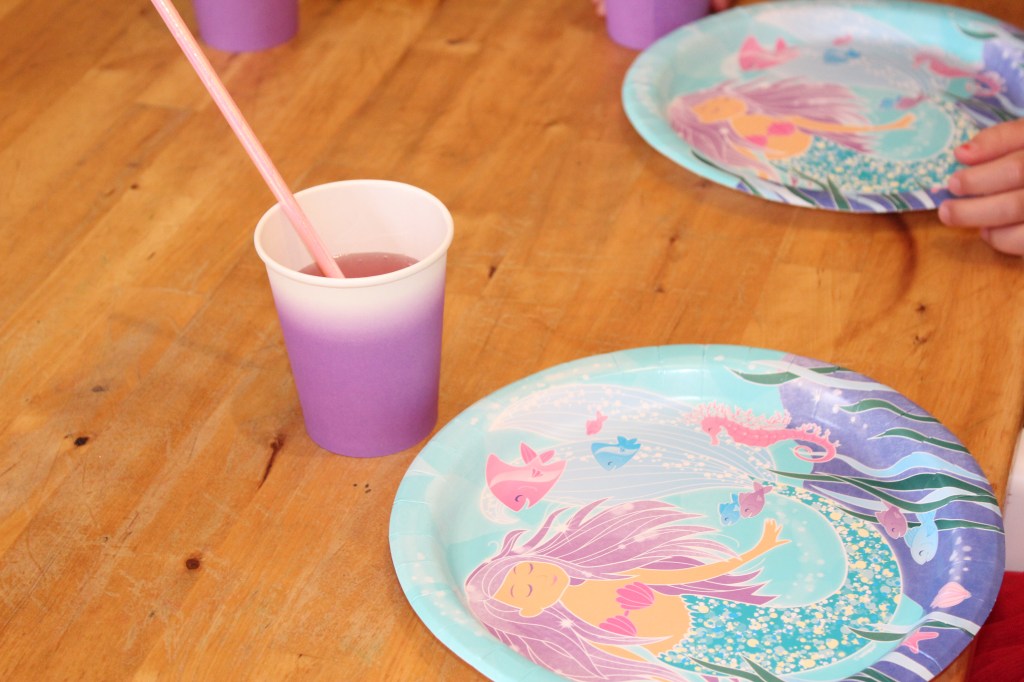 Pour la déco de la table j’ai fait très simple, des pailles scintillants, des bougies scintillants et des assiettes sirènes et des gobelets violets.
