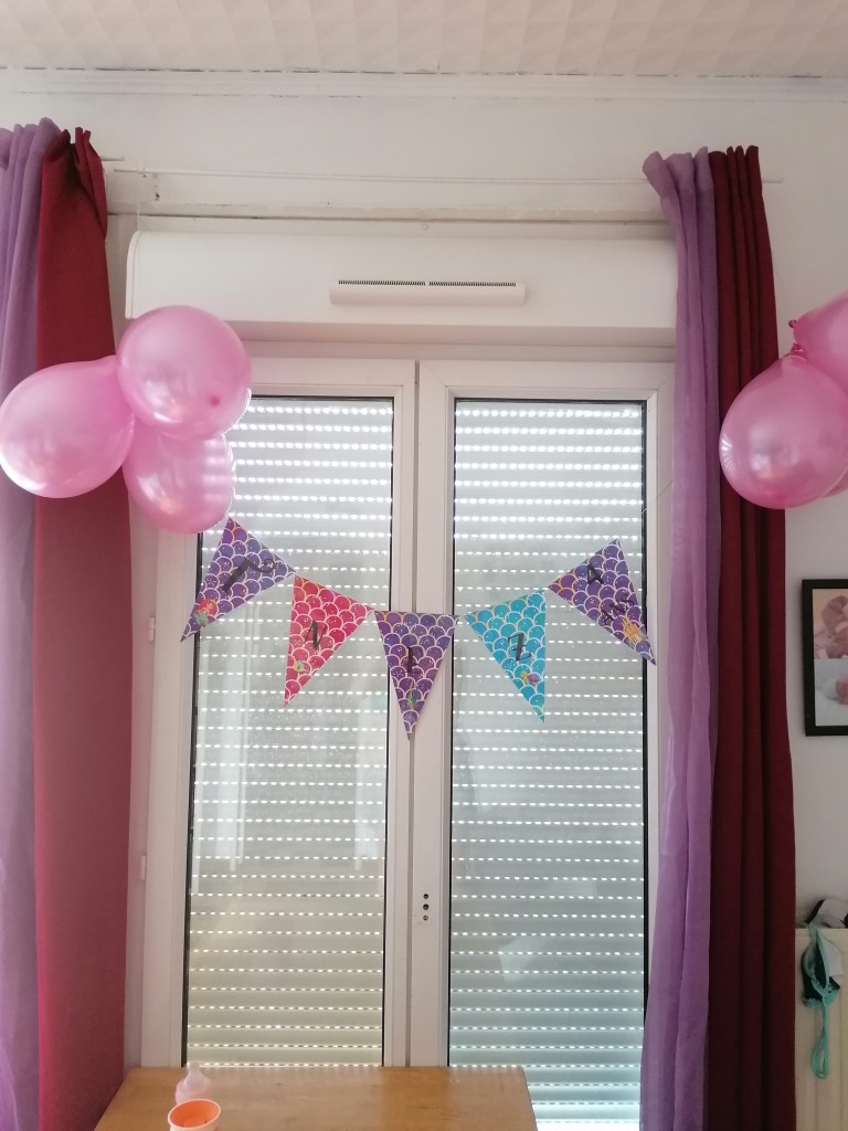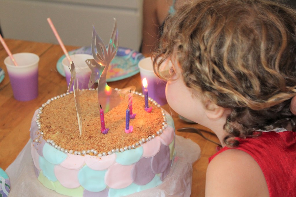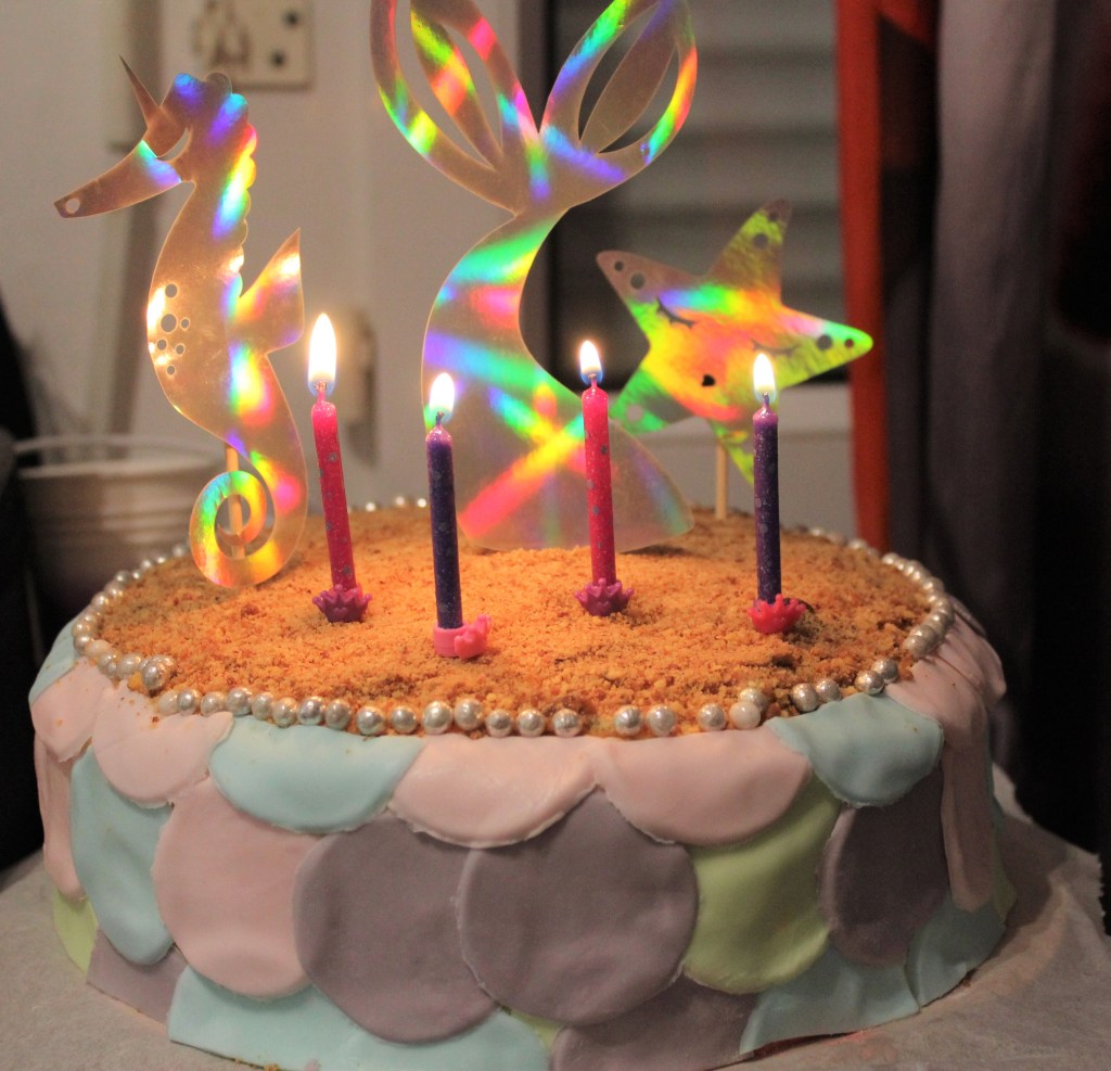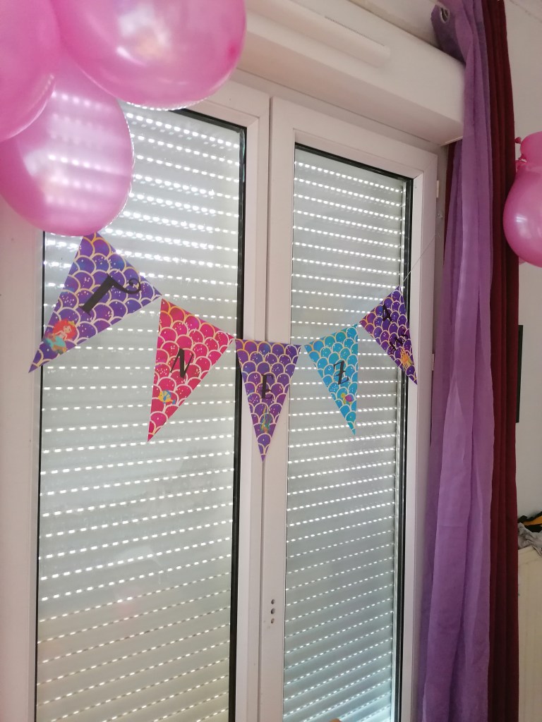 Inez à fêté ses 4 ans le 10 août. Comme le temps passe vite! Fêter son anniversaire en pleine canicule n’est pas une raison de ne pas avoir un joli gâteau.Comme pour les grands j’ai créé une fanion d’anniversaire sur le thème sirène.
