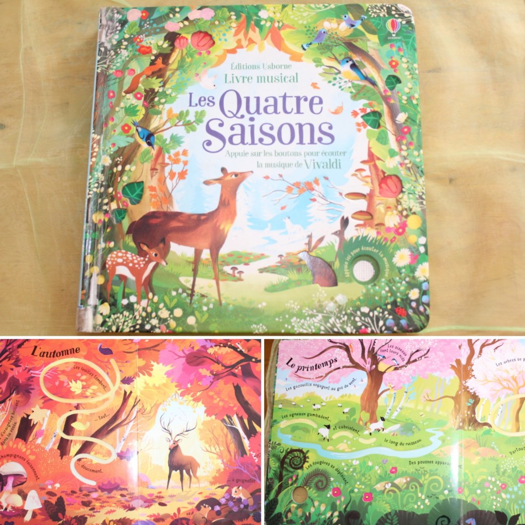 Les quatre saisons – ce livre est un des livres préféré de mes enfants, la musique de Vivaldi est beaucoup apprécié chez nous et avec les illustrations doux ainsi que le côté tactile rend ce livre très intéressant .