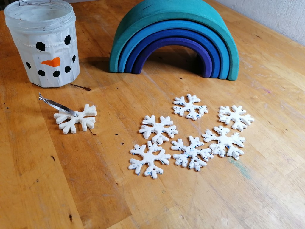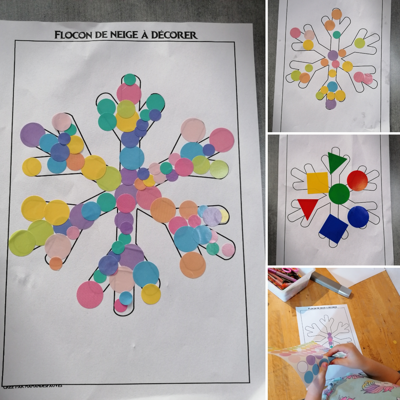 Bonhomme de neige en duplo Enfiler des perles et construire des tours Coller des gommettes Un flocon de neige en scotch