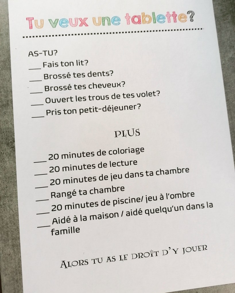 Qui dit vacances dit les enfants à la maison. Pour gérer le temps des écrans durant les vacances j’ai créé une fiche pour motiver mes troupes à faire autre chose que de squatter les écrans 😂