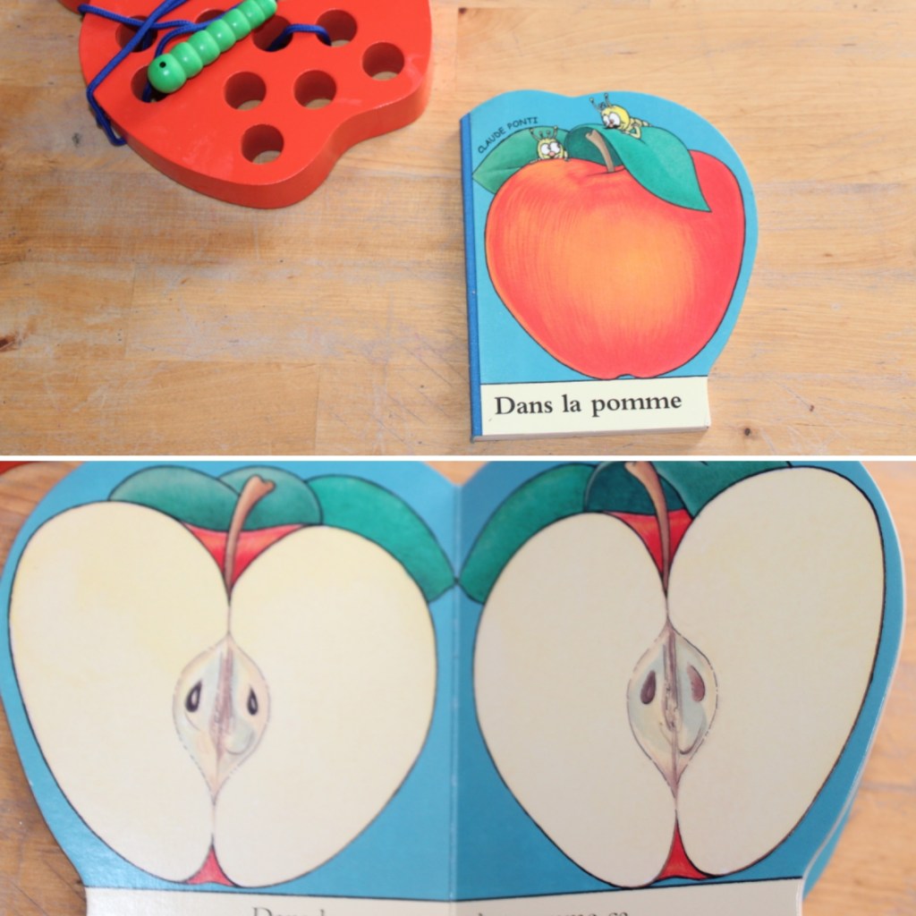Dans la pomme – L’important, c’est ce qui n’est pas visible d’emblée, ce qui se cache, ce qu’on imagine : une bibliothèque dans la pomme, pour les longues soirées du ver.