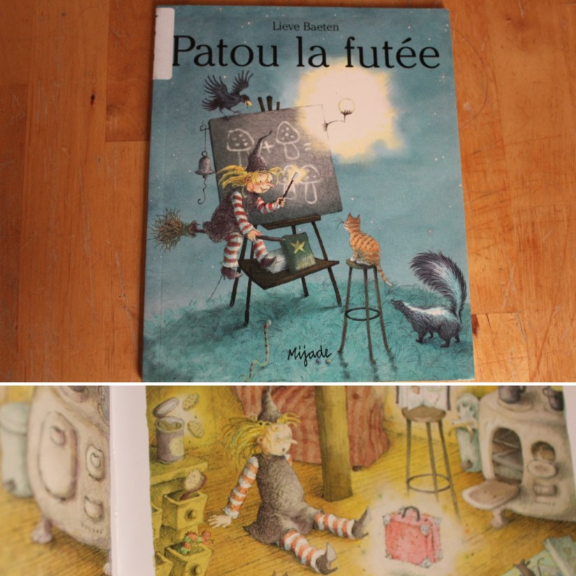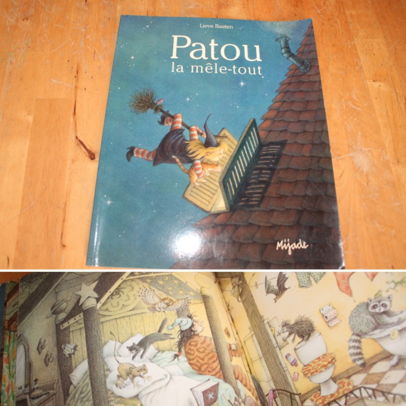 Patou la mêle-tout – Patou, la petite sorcière en herbe, est curieuse. Elle pénètre dans le grenier d’une maison et casse son balai. Les sorcières qui vivent là sont douées pour la musique, la cuisine ou encore la sieste, mais qu’on ne leur demande pas de réparer un balai cassé! Finalement¿ Patou arrive dans la cave où vit la sorcière bricoleuse.