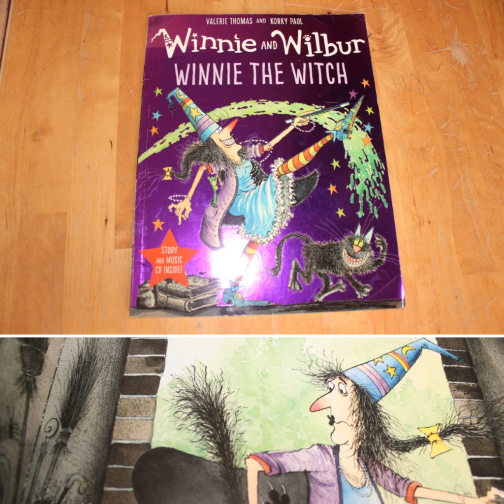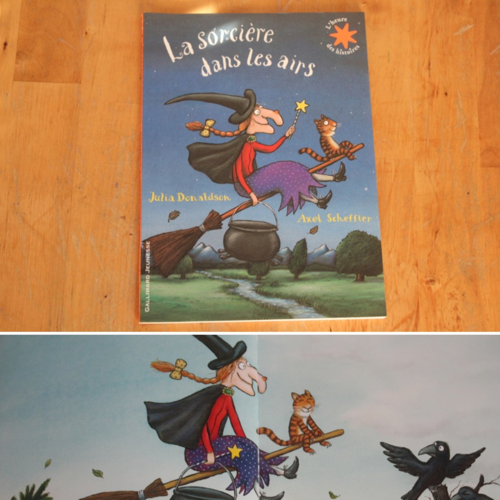 La sorcière dans les airs – vous reconnaissait peut-être l’illustratrice du Gruffalo? La sorcière était rousse, elle avait une longue tresse, un chapeau noir très haut et un chat plein d’adresse. Le chat ronronnait fort, la sorcière souriait, tandis que dans les airs s’élevait leur balai…