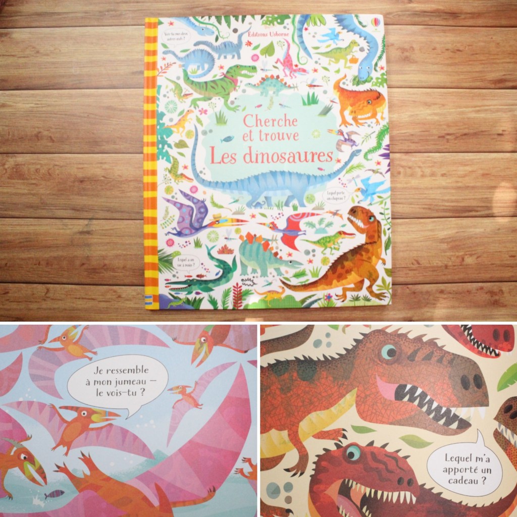 Cherche et trouve les dinosaures – des jolis illustations qui ne font pas peur ou il faut chercher des objets ou des dinosaures.