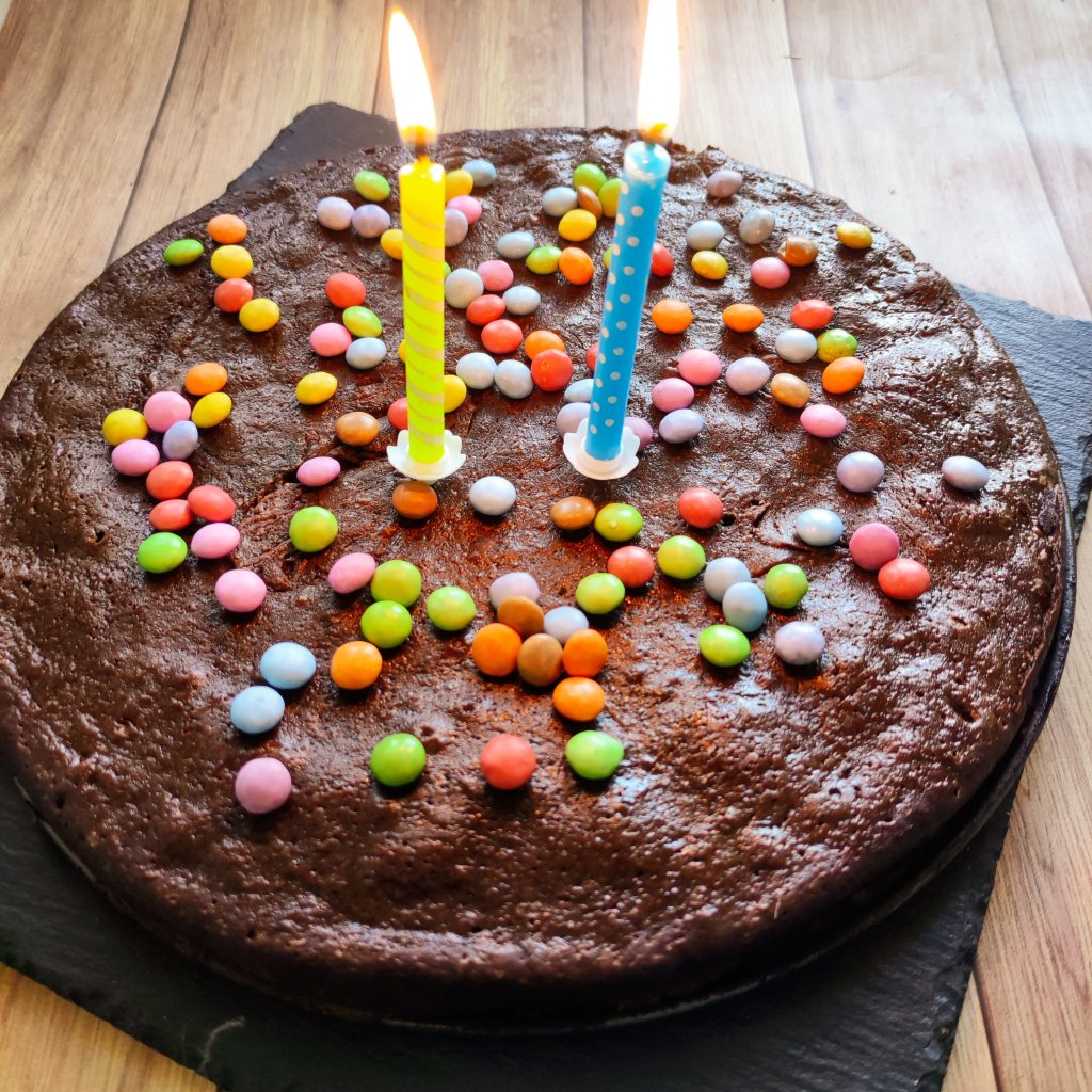Tout mélanger puis verser dans un moule beurré et fariné puis cuire 12 minutes à 200 degrés. Laisser refroidir complètement pour une découpe facile. Ici on l’a décoré avec des Smarties car c’est les bonbons préférés d’Ezekiel.