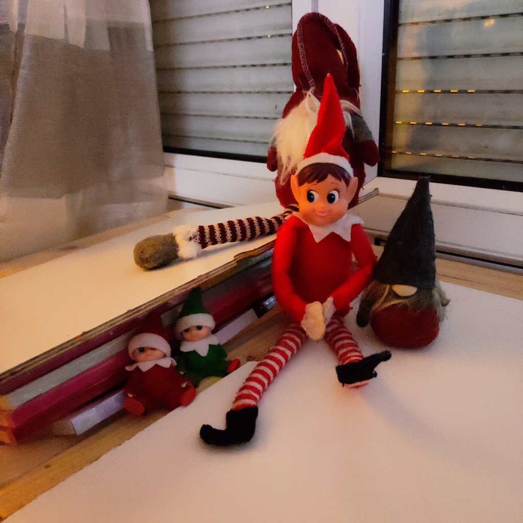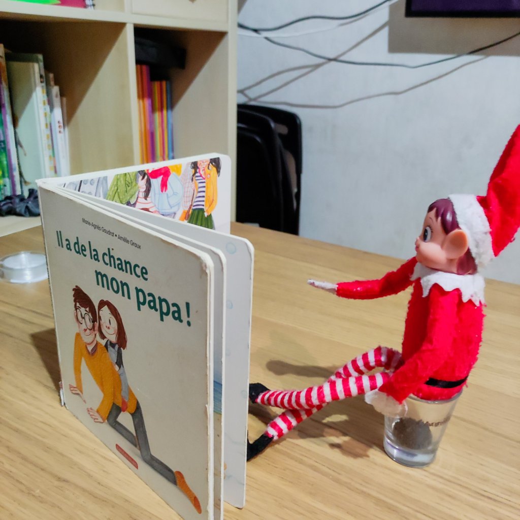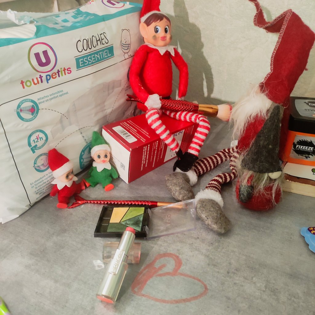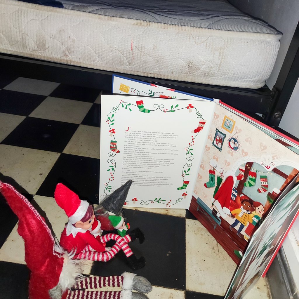 1er décembre ils ont cachés les calendriers de Noël 2 décembre ils sont coincés dans le fouet du robot 3 décembre ils ont débarqué dans mon bureau 4 décembre ils ont joué avec le maquillage de maman 5 décembre ils ont dessiné avec de la mousse à raser 6 décembre st Nicolas à apporté des cadeaux 7 décembre ils se cachent du lion 8 décembre farfouille lit un livre en faisant caca 9 décembre ils ont dessiné sur la télé 10 décembre ils se sont emmitouflés dans le frigo 11 décembre cache cache dans le sapin 12 décembre une partie de 7 familles 13 décembre train de ste Lucie avec les chaussures et une poupée 14 décembre il y a du PQ partout dans la chambre 15 décembre farfouille à prit en otage les autres 16 décembre les lutins ont cru qu’ils allaient pouvoir manger les poissons 17 décembre les WC en bonhomme de neige 18 décembre les lutins regardent les cahiers d’école 19 décembre ils font de la moto 20 décembre ils sont coincés dans l’arbre 21 décembre soupe à la chaussette 22 décembre ils ont mangé les caramels 23 décembre ils ont mangé la maison de pain d’épices 24 décembre une histoire de Noël