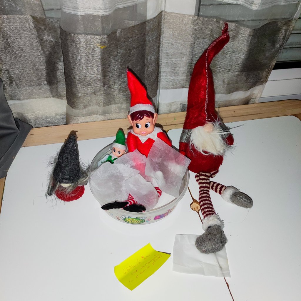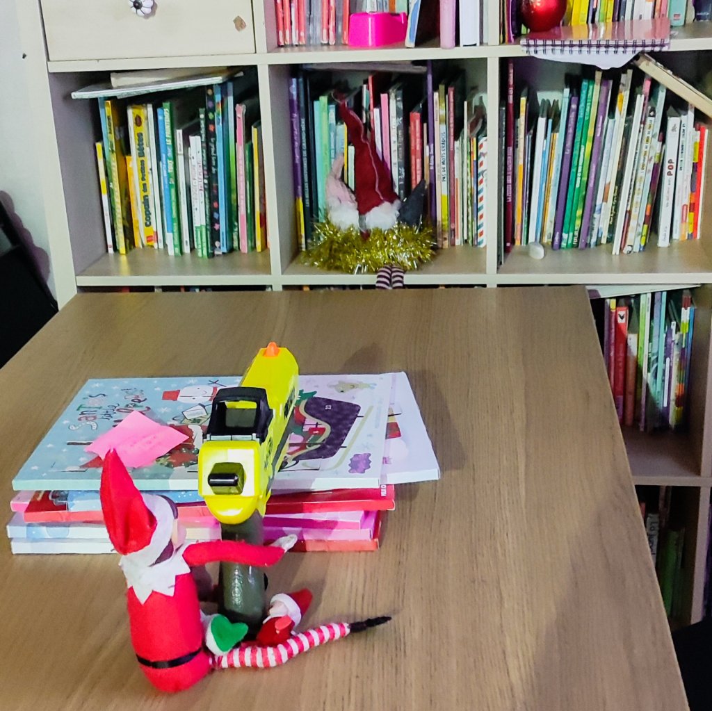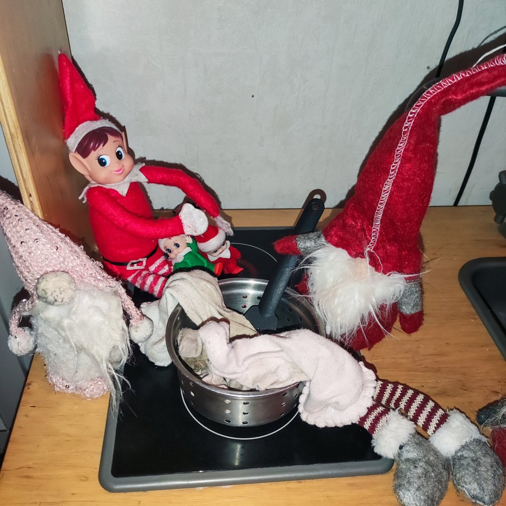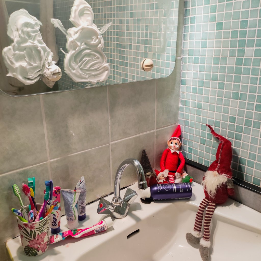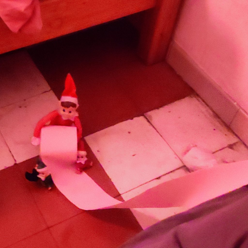 1er décembre ils ont cachés les calendriers de Noël 2 décembre ils sont coincés dans le fouet du robot 3 décembre ils ont débarqué dans mon bureau 4 décembre ils ont joué avec le maquillage de maman 5 décembre ils ont dessiné avec de la mousse à raser 6 décembre st Nicolas à apporté des cadeaux 7 décembre ils se cachent du lion 8 décembre farfouille lit un livre en faisant caca 9 décembre ils ont dessiné sur la télé 10 décembre ils se sont emmitouflés dans le frigo 11 décembre cache cache dans le sapin 12 décembre une partie de 7 familles 13 décembre train de ste Lucie avec les chaussures et une poupée 14 décembre il y a du PQ partout dans la chambre 15 décembre farfouille à prit en otage les autres 16 décembre les lutins ont cru qu’ils allaient pouvoir manger les poissons 17 décembre les WC en bonhomme de neige 18 décembre les lutins regardent les cahiers d’école 19 décembre ils font de la moto 20 décembre ils sont coincés dans l’arbre 21 décembre soupe à la chaussette 22 décembre ils ont mangé les caramels 23 décembre ils ont mangé la maison de pain d’épices 24 décembre une histoire de Noël