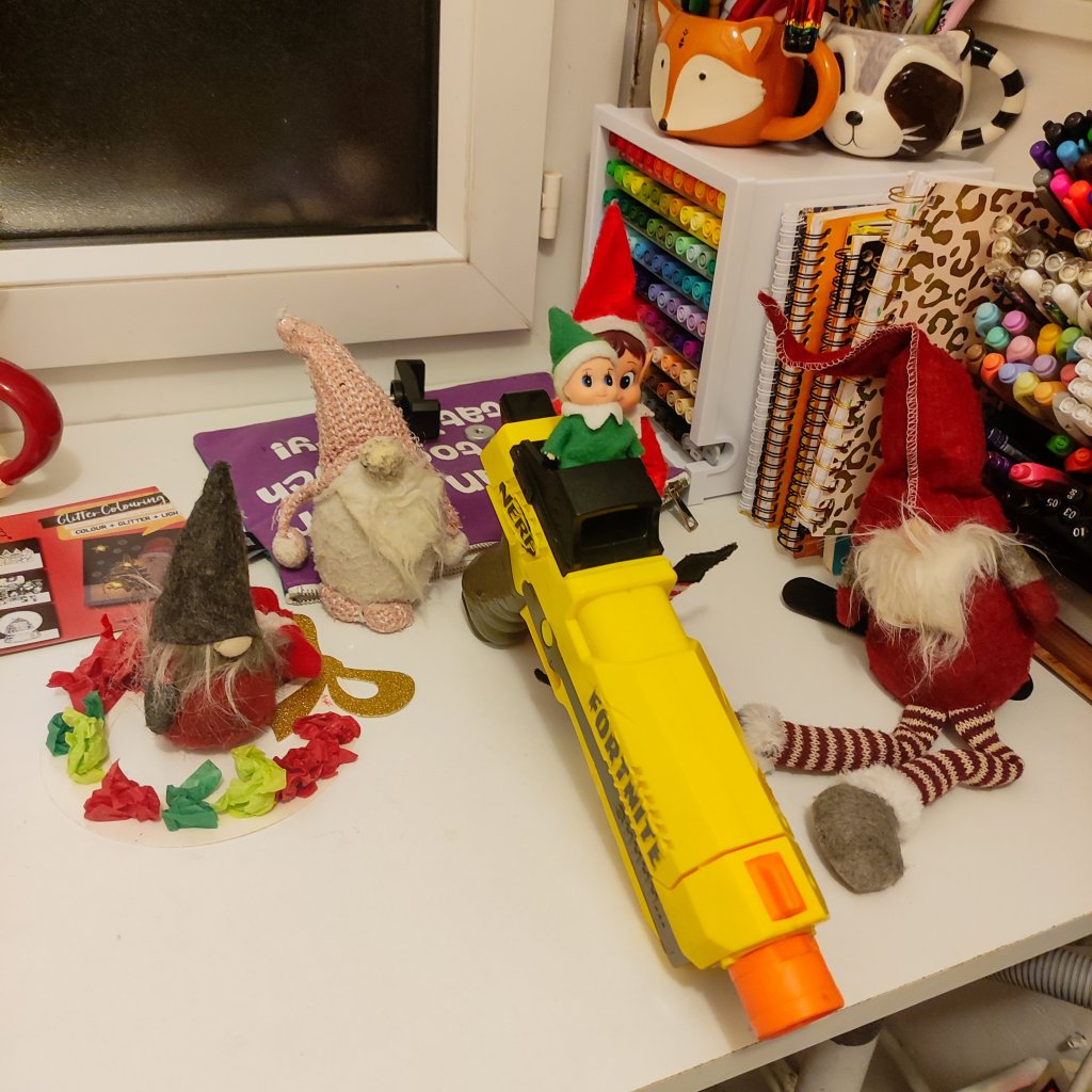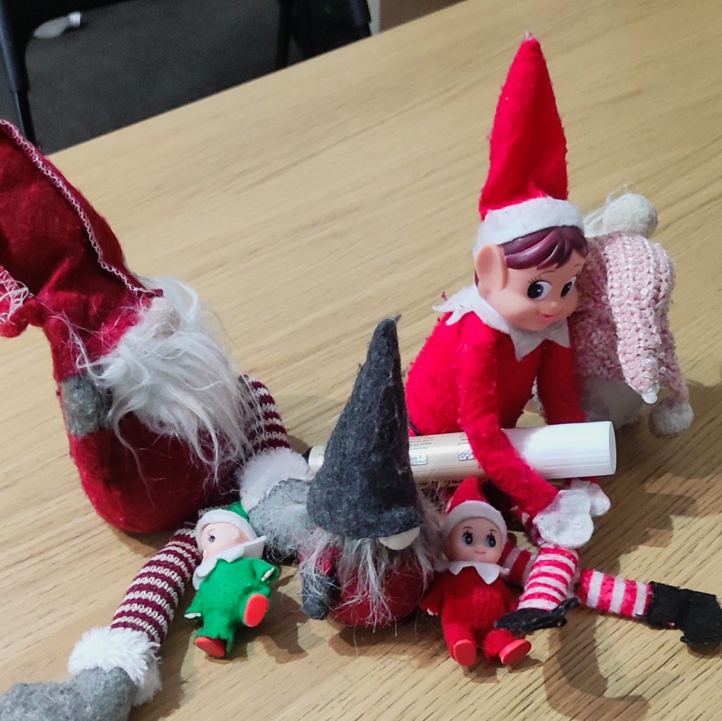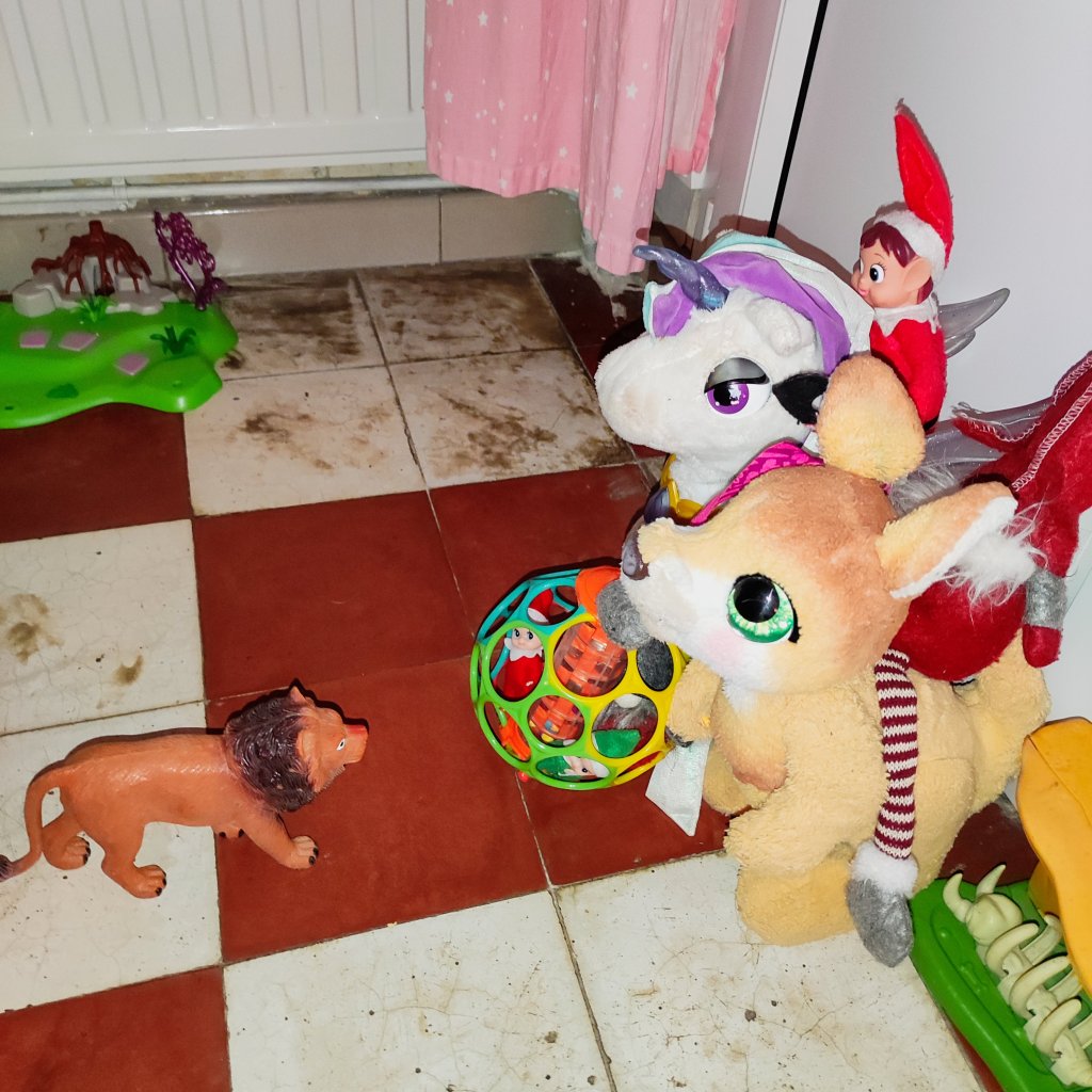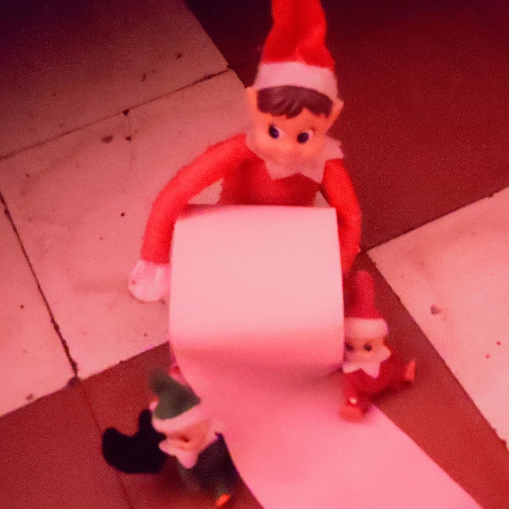1er décembre ils ont cachés les calendriers de Noël 2 décembre ils sont coincés dans le fouet du robot 3 décembre ils ont débarqué dans mon bureau 4 décembre ils ont joué avec le maquillage de maman 5 décembre ils ont dessiné avec de la mousse à raser 6 décembre st Nicolas à apporté des cadeaux 7 décembre ils se cachent du lion 8 décembre farfouille lit un livre en faisant caca 9 décembre ils ont dessiné sur la télé 10 décembre ils se sont emmitouflés dans le frigo 11 décembre cache cache dans le sapin 12 décembre une partie de 7 familles 13 décembre train de ste Lucie avec les chaussures et une poupée 14 décembre il y a du PQ partout dans la chambre 15 décembre farfouille à prit en otage les autres 16 décembre les lutins ont cru qu’ils allaient pouvoir manger les poissons 17 décembre les WC en bonhomme de neige 18 décembre les lutins regardent les cahiers d’école 19 décembre ils font de la moto 20 décembre ils sont coincés dans l’arbre 21 décembre soupe à la chaussette 22 décembre ils ont mangé les caramels 23 décembre ils ont mangé la maison de pain d’épices 24 décembre une histoire de Noël