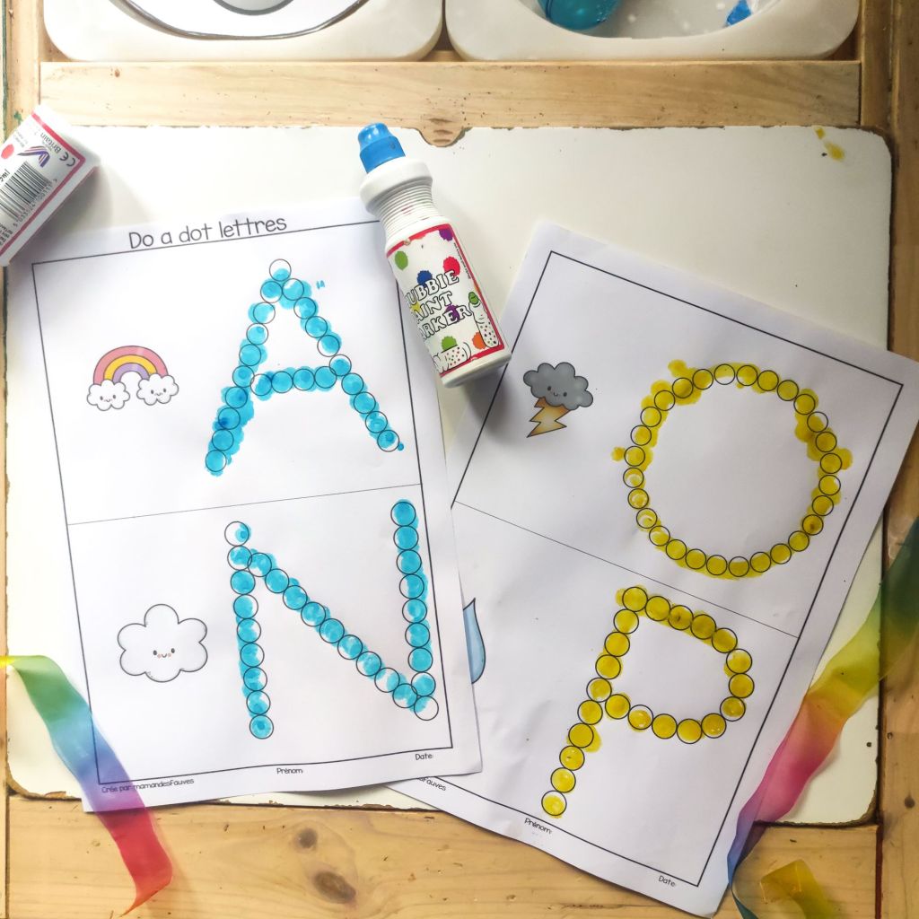Ceci est une activité qu’on avait fait pour travailler autour du thème des arc-en-ciel l’année dernière, ils nous en restaient alors on en a profité. Ceci c’est aussi une activité de motorisé fine qui permet de travailler les séquences, les couleurs ainsi que la coordination main oeil.