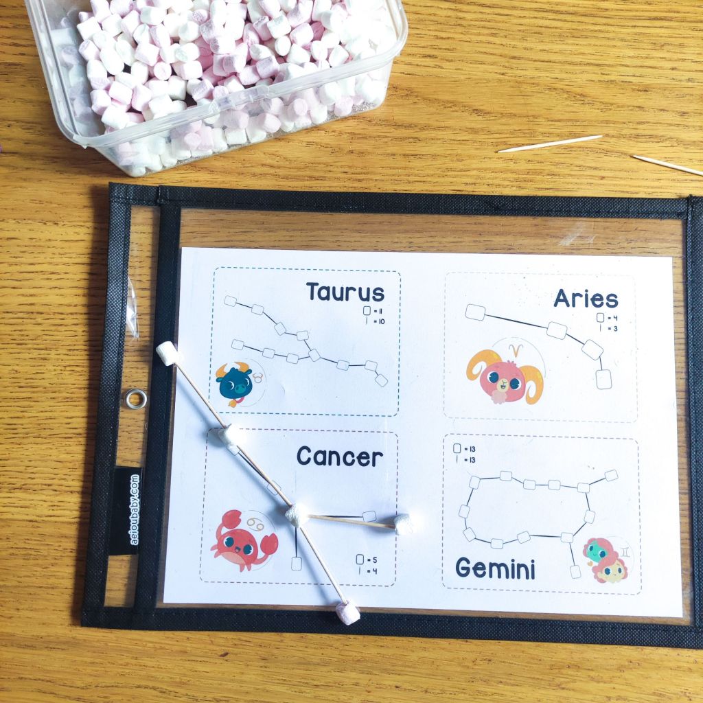 Les guimauves et des cure-dents sont tout ce dont vous avez besoin pour recréer des constellations célèbres. Imprimez des modèles de constellations telles que la Grande Ourse, Orion ou Cassiopée, et laissez les enfants recréer ces motifs en utilisant des guimauves pour les étoiles et des cure-dents pour les relier. Une activité délicieuse qui enseigne aussi la géographie céleste !