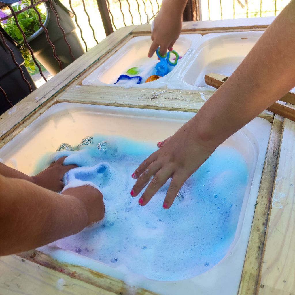 Un bac sensoriel est toujours une excellente idée pour engager les sens des enfants. Pour un bac sensoriel sur le thème de l’espace, vous pouvez utiliser des éléments comme du riz coloré noir ou bleu foncé pour représenter l’espace, des petites étoiles en plastique, des figurines de planètes, des astronautes miniatures, et même quelques pierres précieuses pour simuler des météorites ou des astéroïdes. Les enfants peuvent explorer ces éléments et inventer leurs propres histoires d’exploration spatiale. Nous on a utilisé de la mousse couleurs de la galaxie.