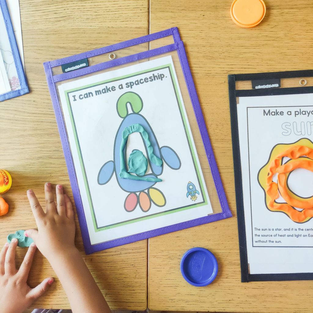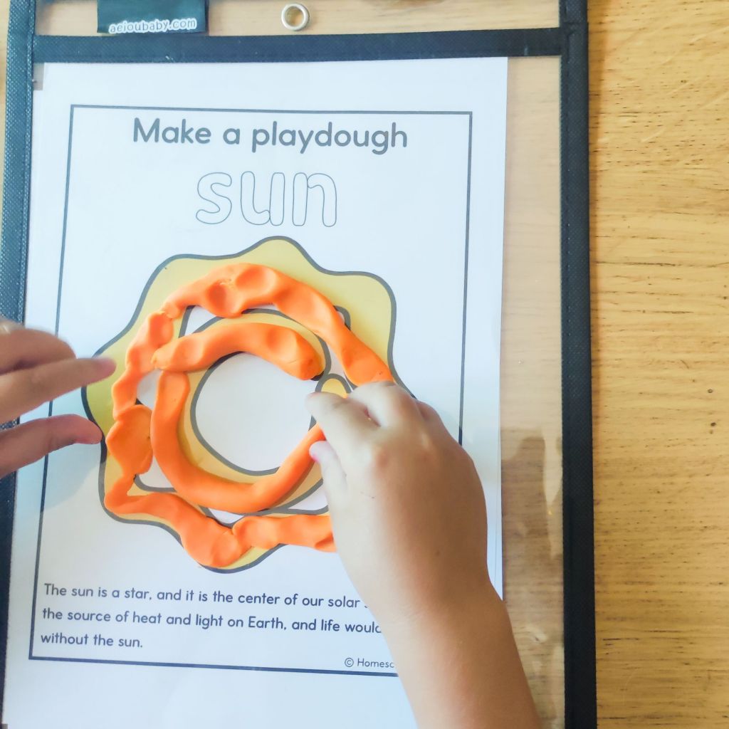 Laissez libre cours à l’imagination des enfants en leur fournissant de la pâte à modeler de différentes couleurs pour créer leurs propres planètes. Encouragez-les à penser aux textures et aux couleurs des différentes planètes du système solaire. Ils peuvent ajouter des détails comme des anneaux autour de Saturne ou des volcans sur Mars. C’est une activité parfaite pour développer la motricité fine tout en s’amusant ! Nous avons utilisé des tapis de pâte à modeler comme modèles.