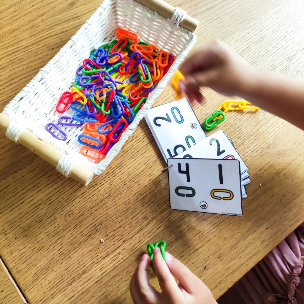 Pour renforcer les compétences en mathématiques et en motricité fine, nous avons commencé par une activité de chaînes à compter. Les enfants ont utilisé des maillons colorées pour créer des chaînes en suivant un modèle de nombres. Non seulement cela les aide à pratiquer le comptage, mais cela leur permet aussi de travailler sur la reconnaissance des couleurs et des motifs. C’est un excellent exercice pour développer leur concentration et leur coordination main-œil !