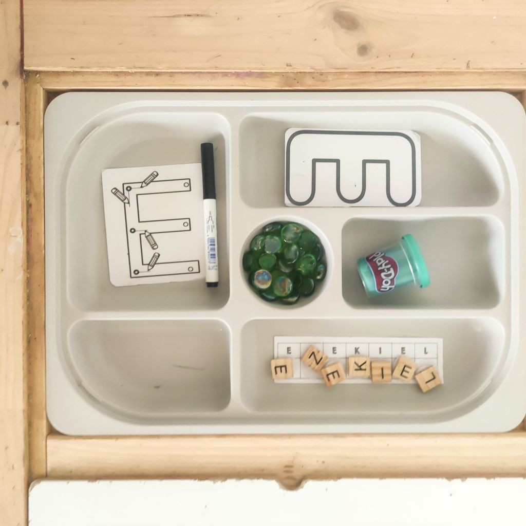 J’ai personnalisé l’apprentissage d’Ezekiel en nous concentrant sur la première lettre de son prénom. Comme vous pouvez voir il a pu utiliser de la pâte à modeler, un feutre effaçable à sec, des galets en verre et des gommettes ce qui lui a permis de s’exprimer de manière créative.