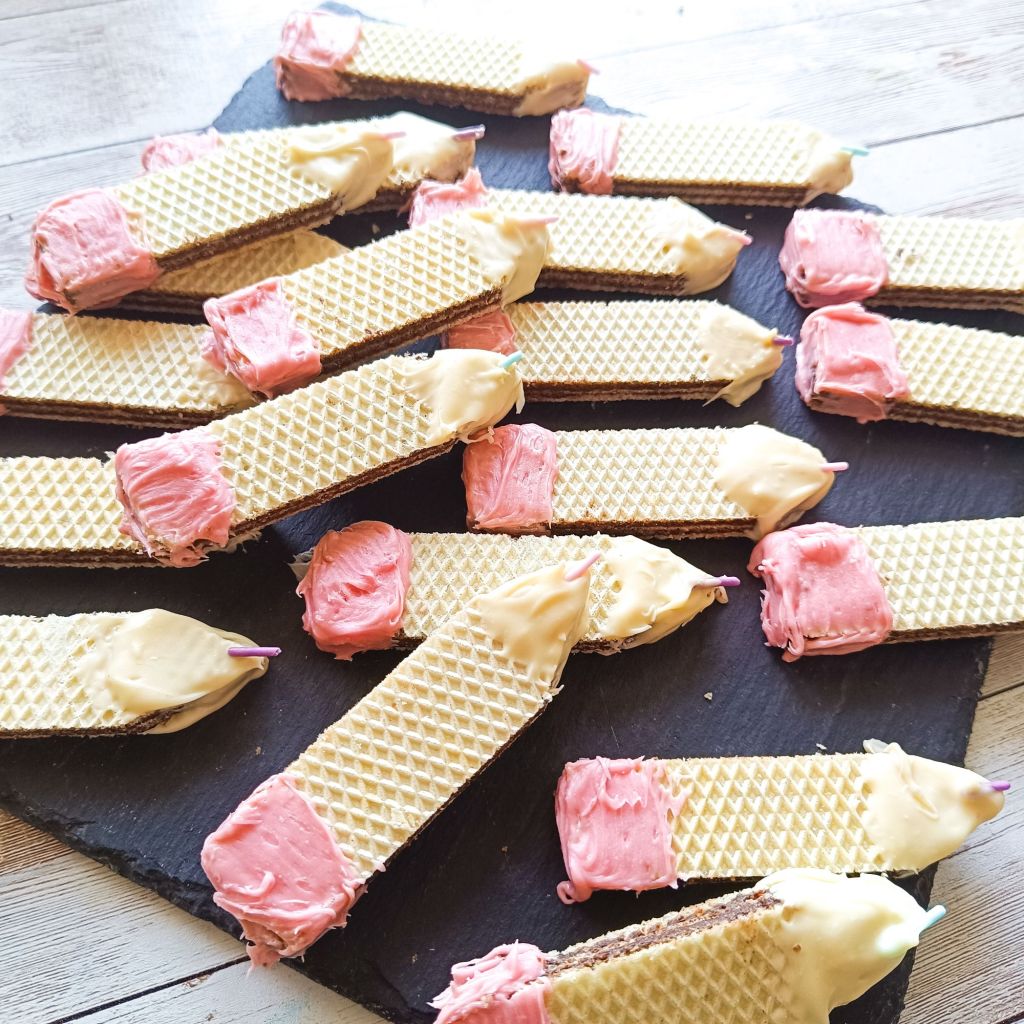 En restant dans le thème de la rentrée, nous avons réalisé des gaufrettes en forme de crayons. Nous avons utilisé des gaufrettes que nous avons décorées avec du chocolat et des vermicelles pour représenter les pointes et les gommes. C’était non seulement amusant, mais aussi une manière ludique de rappeler l’importance des outils d’apprentissage.