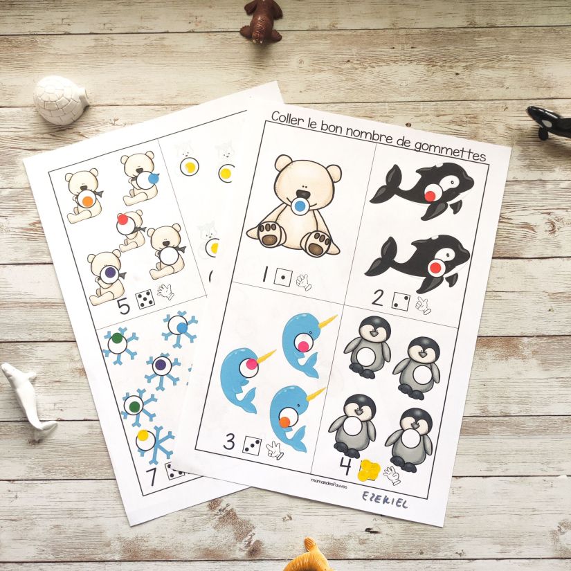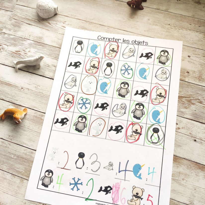 Une autre activité mathématique a consisté à compter des animaux polaires et à colorier le bon nombre d’éléments. En plus de renforcer leurs compétences en numération, les enfants ont enrichi leur vocabulaire en découvrant de nouveaux animaux comme le narval et le renard des neiges.