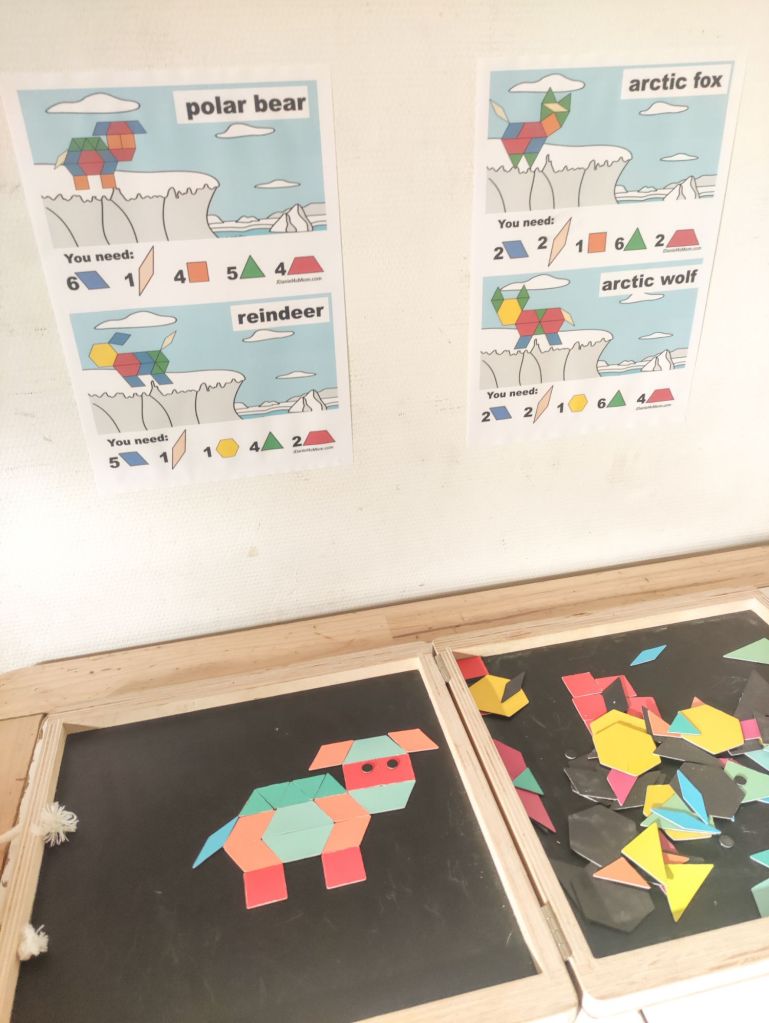 Nous avons introduit des tangrams sur le thème des animaux polaires. En utilisant des formes géométriques, les enfants ont recréé des silhouettes de renard arctique, de renne et d’ours polaires. Un excellent exercice pour la reconnaissance des formes et la résolution de problèmes.