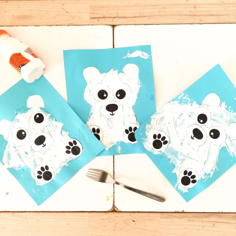 Nous avons exploré une technique de peinture originale pour représenter un ours polaire ! À l’aide de fourchettes trempées dans la peinture blanche, les enfants ont créé l’effet du pelage duveteux de l’ours. Le résultat était aussi adorable qu’amusant à réaliser !