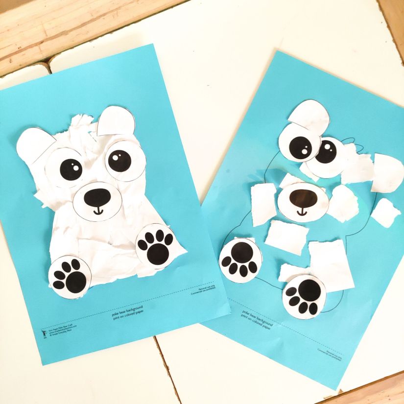 Pour travailler la motricité fine, nous avons utilisé des morceaux de papier blanc déchirés pour composer une silhouette d’ours polaire. Cette activité sensorielle a permis aux enfants de renforcer leur dextérité tout en créant une belle œuvre d’art texturée.