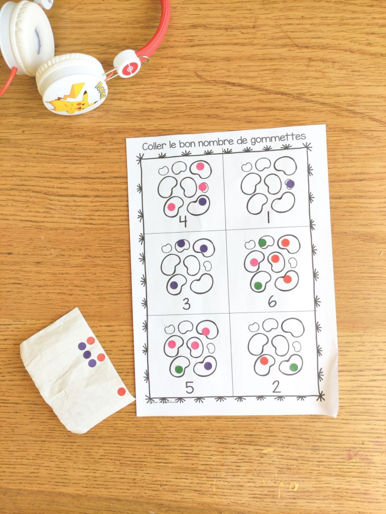 Nous avons utilisé de petits gommettes pour compter, et travailler la reconnaissance visuel des chiffres et leurs nombres correspondant. Les enfants ont aussi mesuré les tiges avec des cubes ou des réglettes.