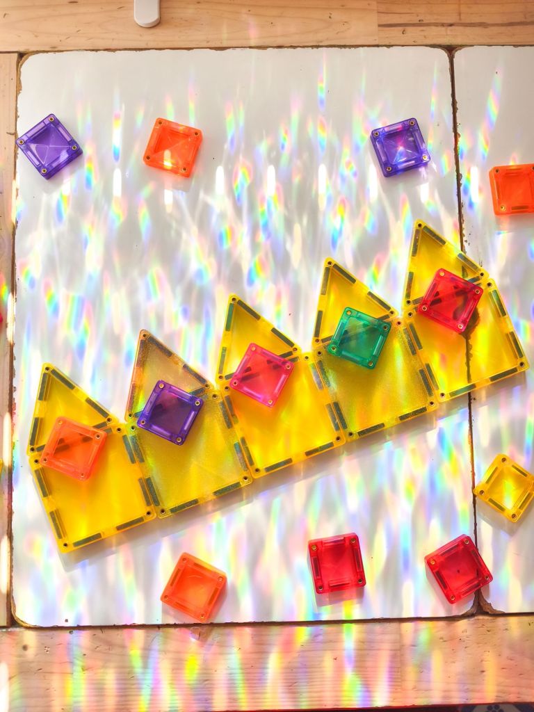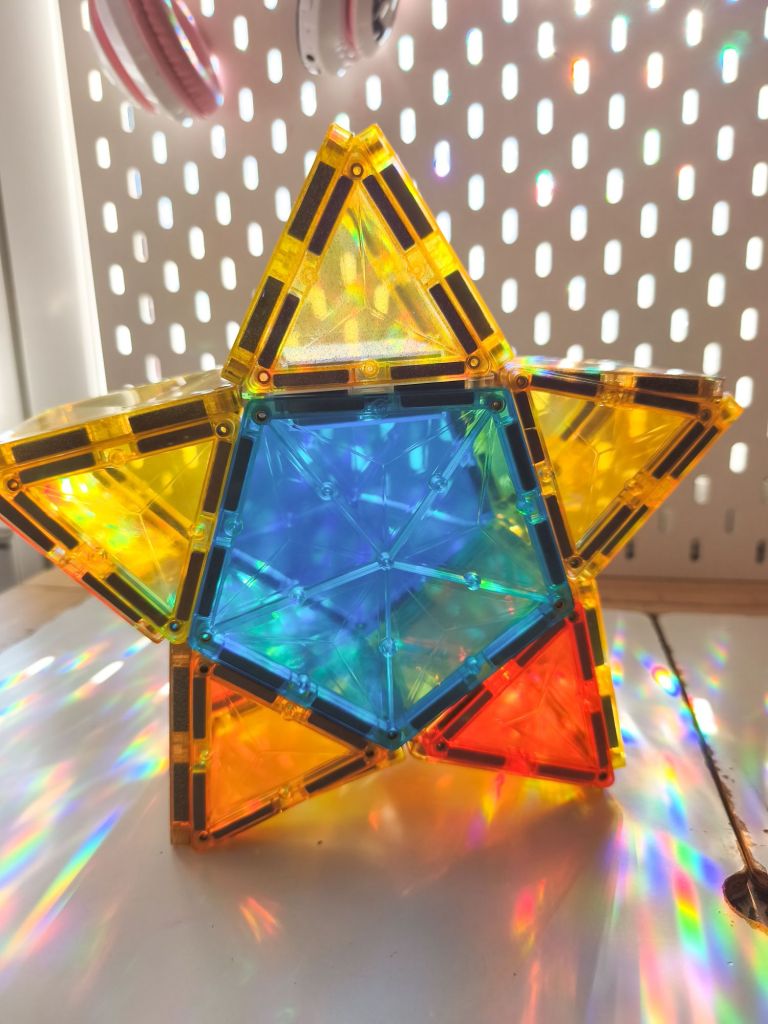 La construction dâune Ă©toile en trois dimensions avec des tuiles aimantĂ©es a permis aux enfants dâexplorer la notion de volume tout en restant dans la thĂ©matique de lâĂpiphanie.